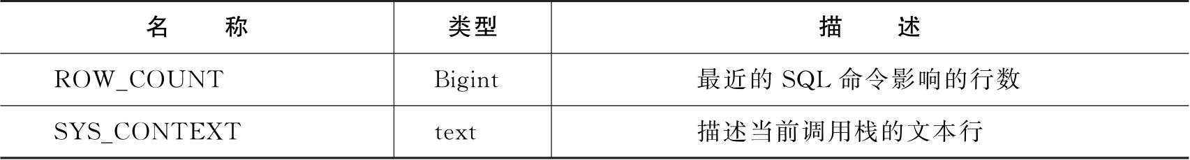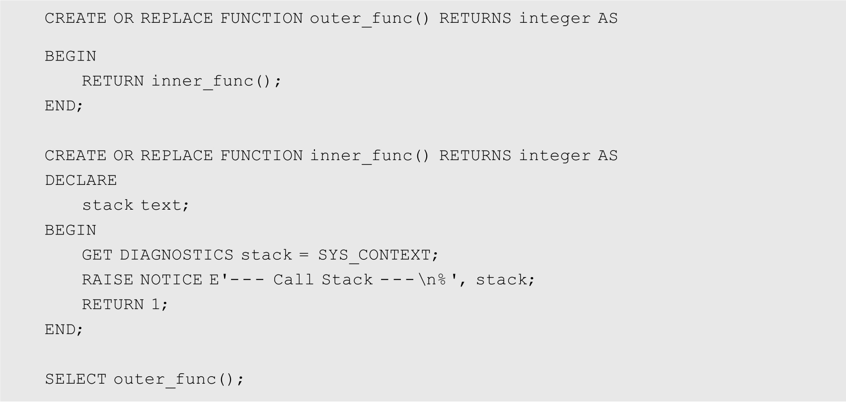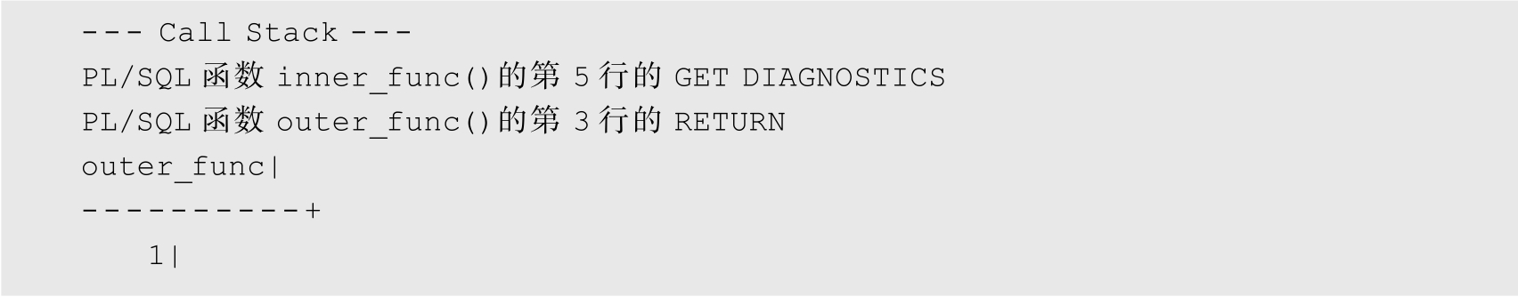 GET DIAGNOSTICS命令检索当前执行状态的信息(GET STACKED DIAGNOSTICS命令会把执行状态的信息报告成一个以前的错误)。它的SYS_CONTEXT状态项可用于标识当前执行位置。状态项SYS_CONTEXT将返回一个文本字符串,其中有描述该调用栈的多行文本。第一行会指向当前函数以及当前正在执行GET DIAGNOSTICS的命令。第二行及其后的行表示调用栈中更上层的调用函数。