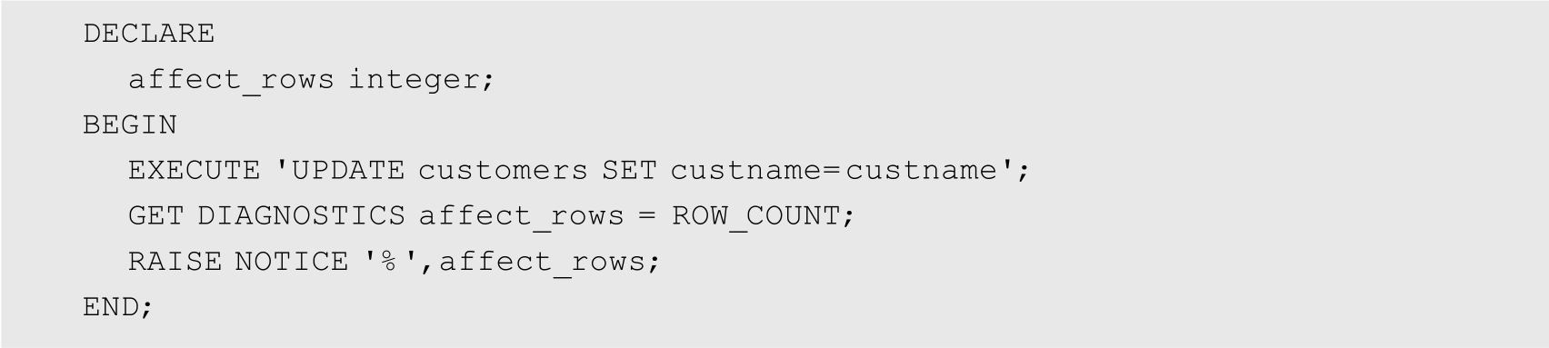 ③如果UPDATE、INSERT以及DELETE语句影响了至少一行,它们会把FOUND设置为true,如果没有影响行,则将其设置为false。