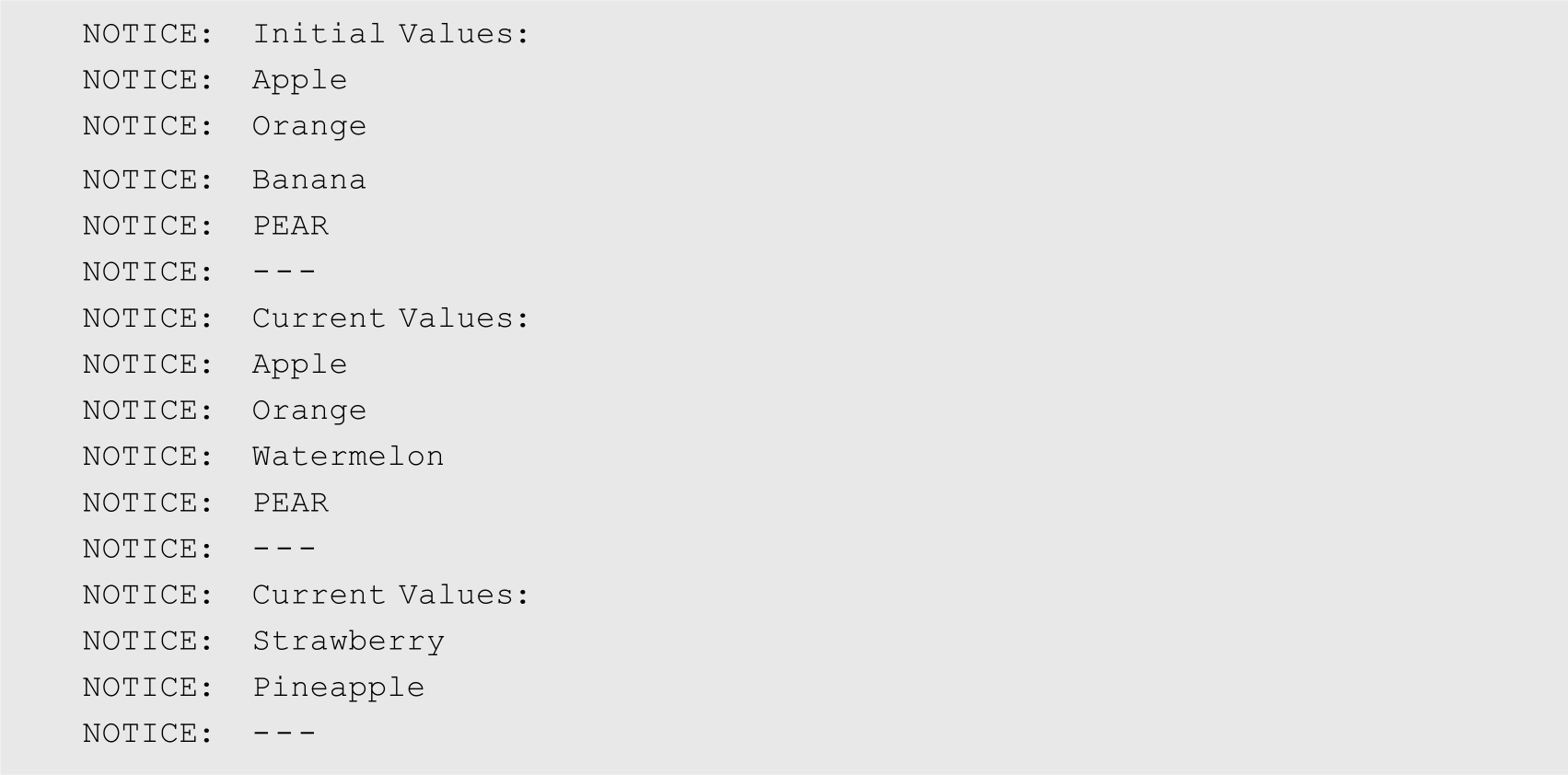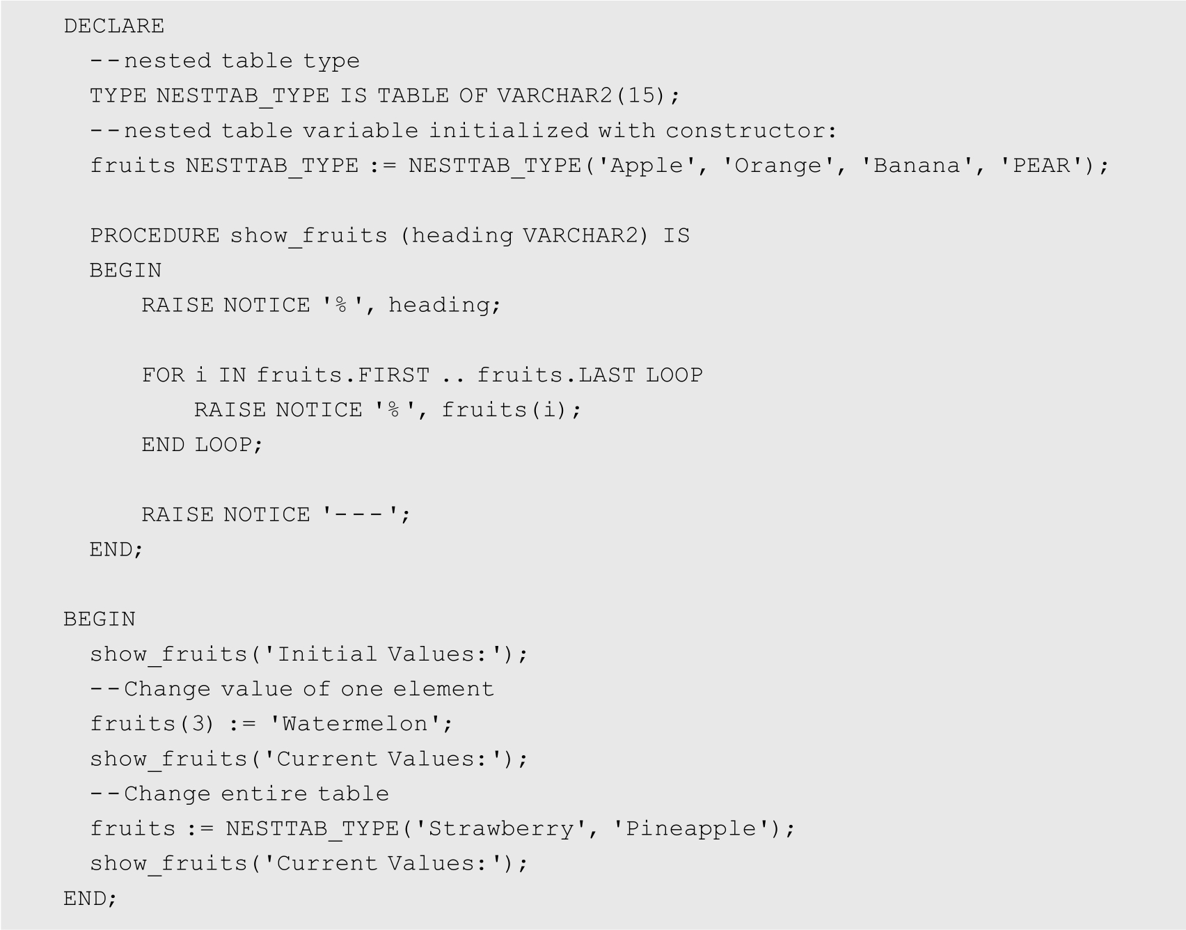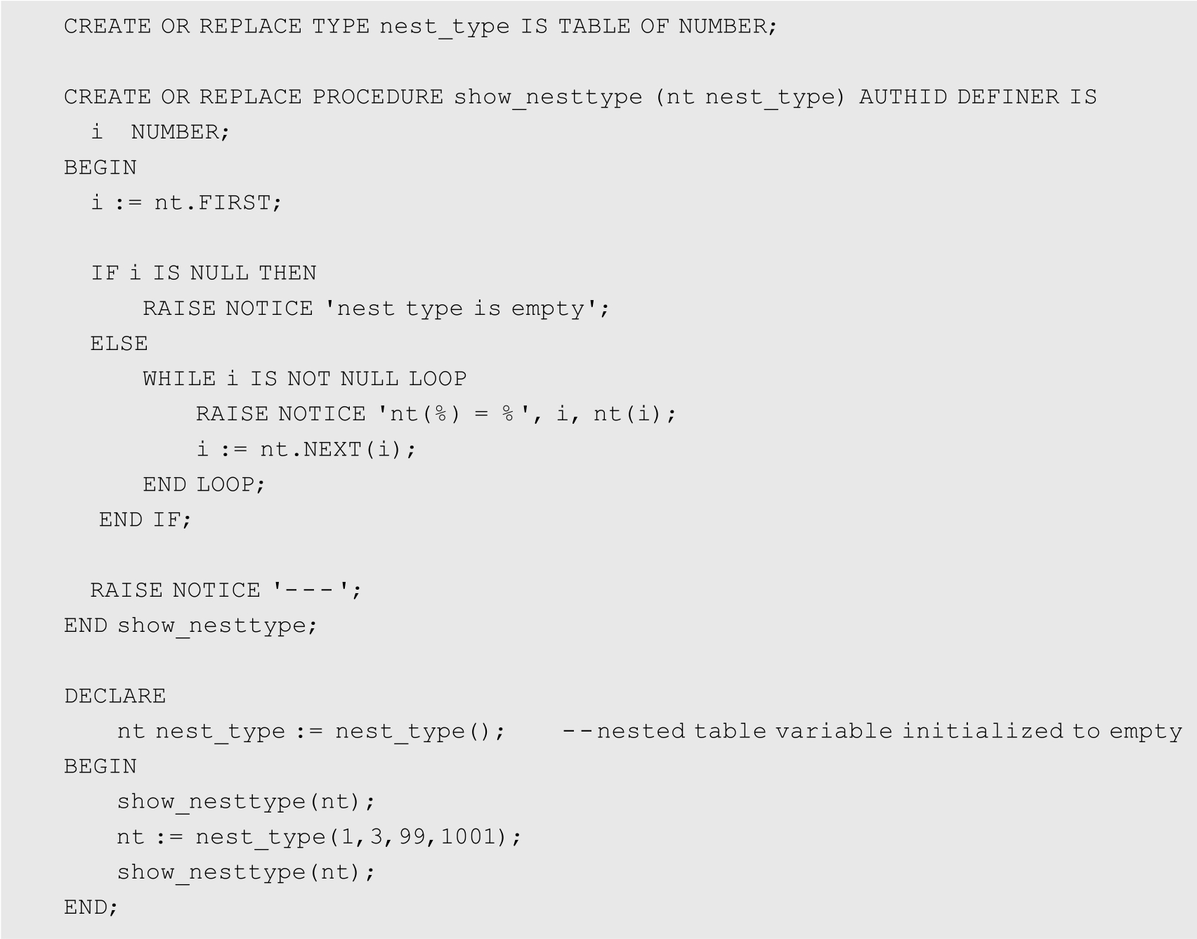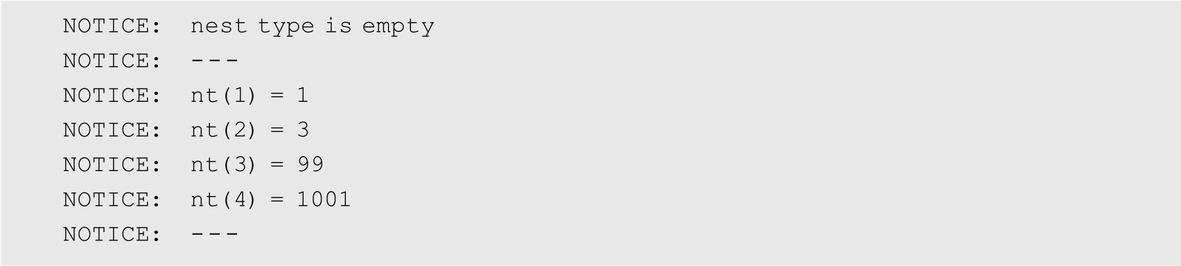 功能描述: 本例定义一个块内部的嵌套表类型,然后声明该类型的变量(使用构造函数初始化),并定义一个打印嵌套表的存储过程。之后调用该存储过程3次:初始化变量后、更改一个元素的值后,以及使用构造函数更改所有元素的值后。在第2次构造函数调用之后,嵌套表只有2个元素,引用元素3会引发错误。