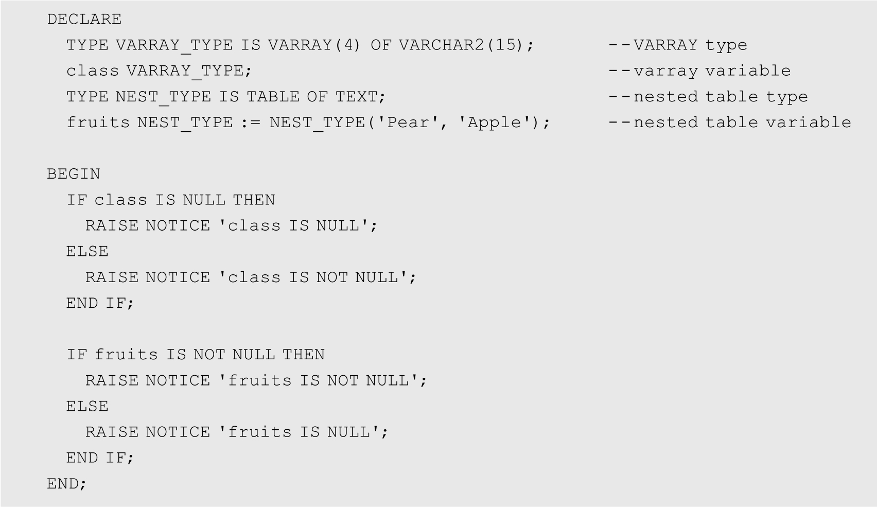 示例3.11: 将可变数组和嵌套表变量与NULL进行比较。