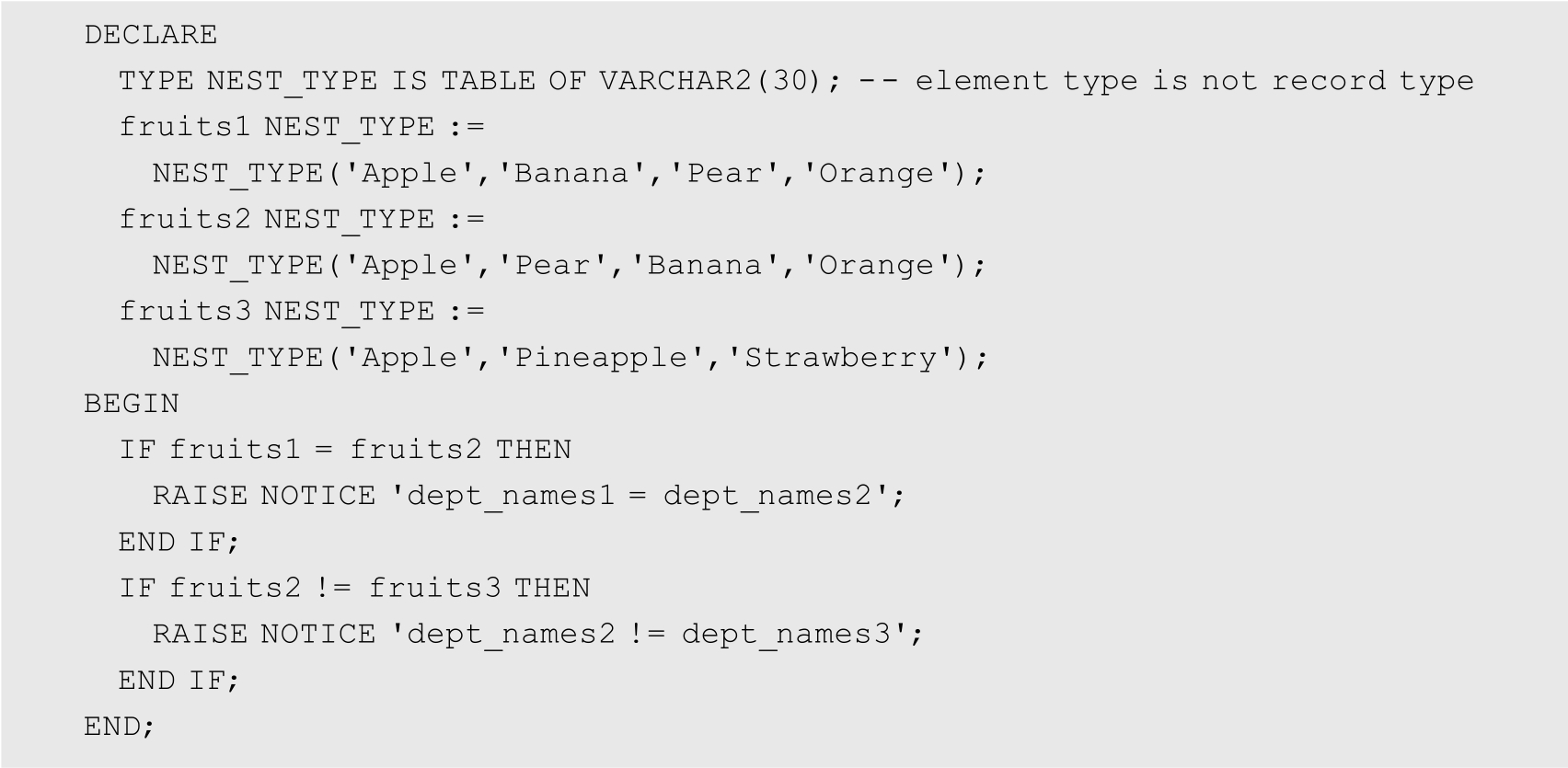 如果两个嵌套表变量具有相同的嵌套表类型,并且该嵌套表类型没有记录类型的元素,则可以使用关系运算符比较这两个变量的相等(=)或不相等(<>,!=,^=)。