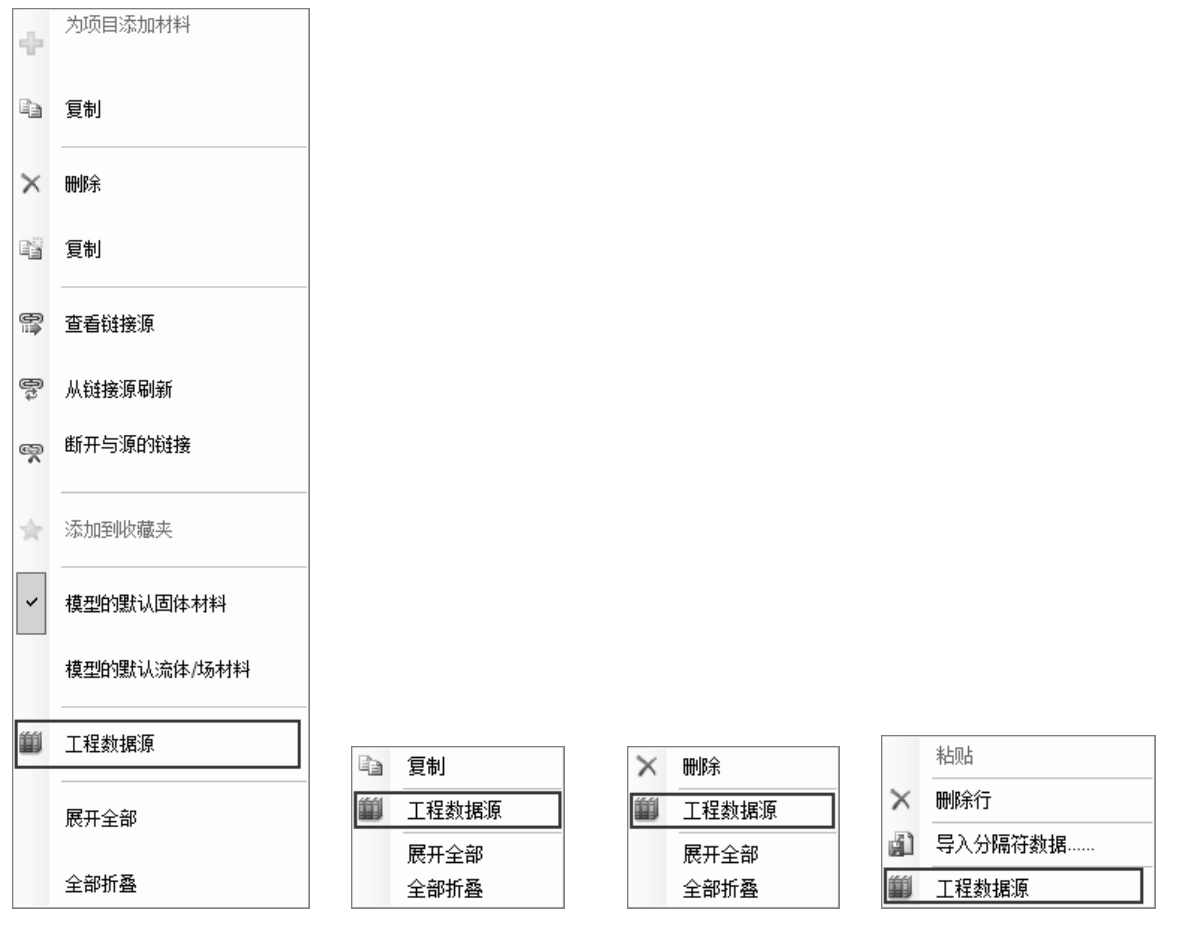 ,或在“工程数据”应用程序窗口中右击,在弹出的快捷菜单中选择“工程数据源”命令,如图1-27所示(在不同的位置右击,所弹出的快捷菜单也会有所不同)。此时“工程数据”应用程序窗口会显示“工程数据源”数据表窗格,如图1-28所示。