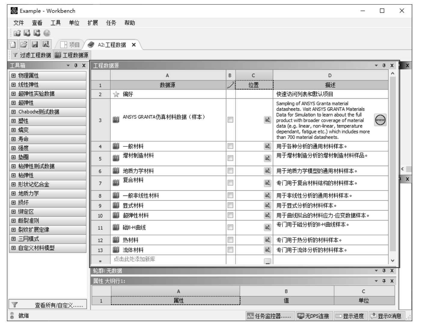 材料库中的材料需要添加到当前的分析项目中才能起作用,向当前项目中添加材料的方法如下:首先打开“工程数据源”数据表,在“工程数据源”窗格中选择一个材料库;然后在下方的轮廓窗格中单击材料后面B列中的添加按钮