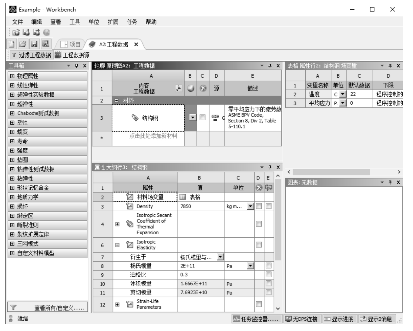 “工程数据”应用程序属于本地应用,进入“工程数据”应用程序的方法如下:首先通过添加工具箱中的分析系统;然后双击系统中的“工程数据”单元格或右击该单元格,在弹出的快捷菜单中选择“编辑……”命令,进入“工程数据”应用程序。进入“工程数据”应用程序后,显示界面如图1-26所示,窗口中的数据是交互式层叠显示的。