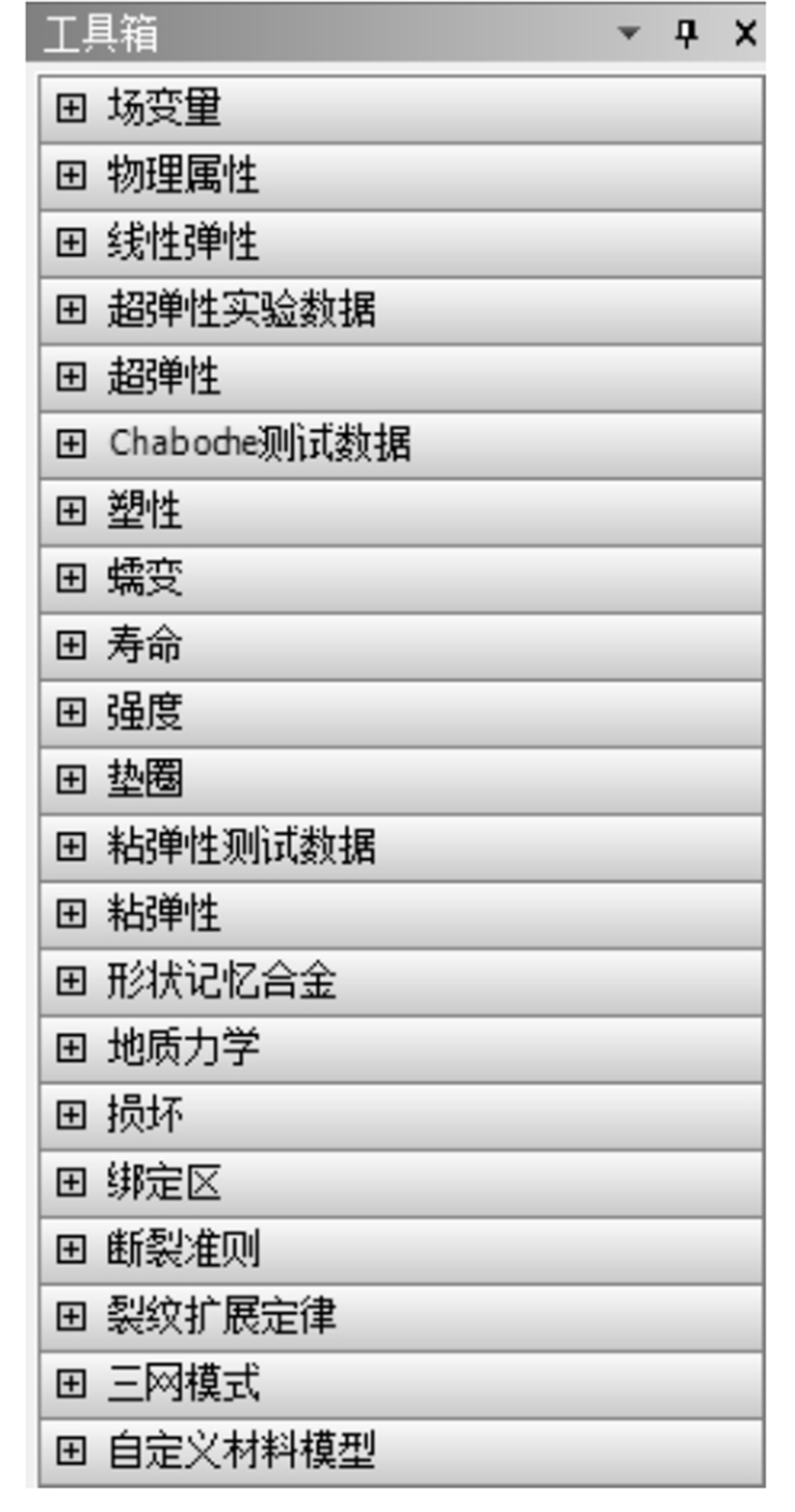 在“工程数据”工具箱中有丰富的材料属性,在定义新材料时,直接将工具箱中的材料属性添加到新定义的材料中即可。工具箱中的材料属性包括场变量、物理属性、线性弹性等,如图1-30所示。
