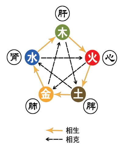 五行学说认为,自然界事物运动变化,存在着木、火、土、金、水五行生克制化规律,五脏由于其生理上特点有所不同而分居五行,五脏之间如五行一样,相生相克、相辅相成,共同维持身体机能正常运转。