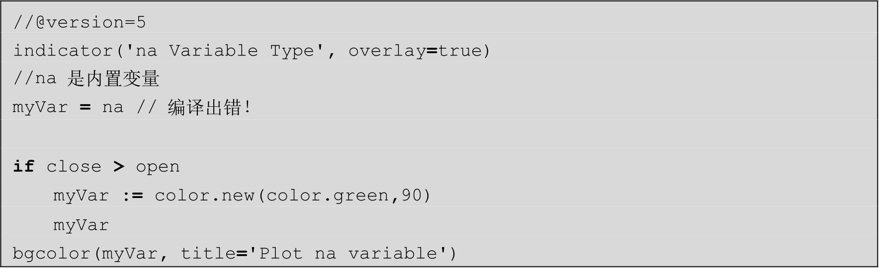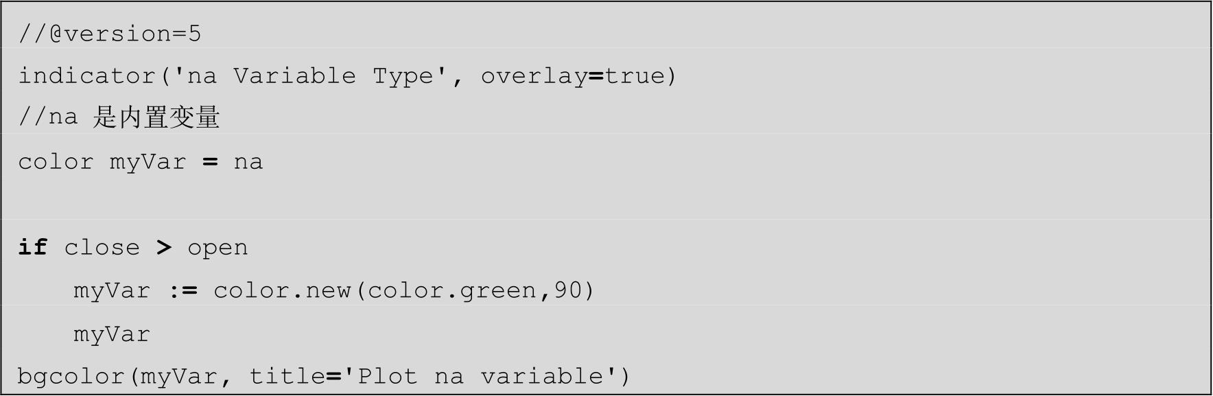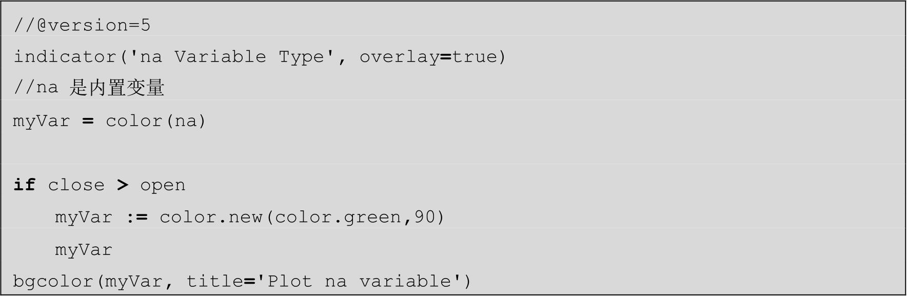 在Pine Script中有一个特殊的内置变量na,它是“not available”的缩写,意思是表达式或变量不可用。na类似Java中的null或者Python中的None。