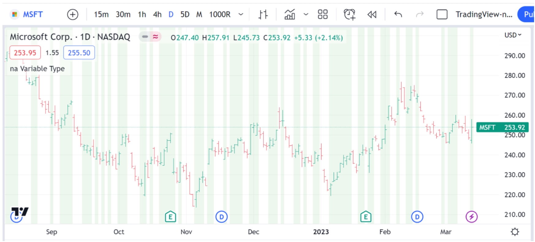 在Pine Editor页面中,单击“Add to chart”选项,把脚本添加到图表中。以微软股票(MSFT)为例,会发现图表背景发生变化,即当K线为阳线时,主图上的背景为浅绿色,如图5-3所示。