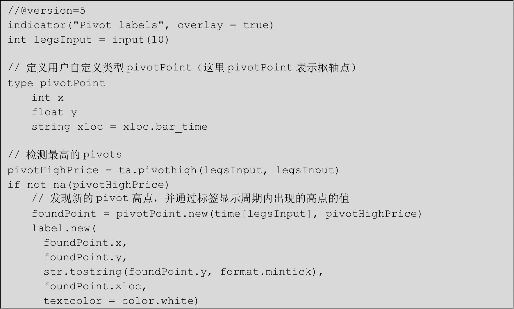 用户自定义类型的使用方法可以参考下面的脚本示例。下面的脚本定义了一个对象pivotPoint,该对象包含了高点的坐标和时间等信息,并使用该对象来存储ta.pivothigh函数的返回值。最后在图表上使用标签表示指定周期内出现的高点。脚本如下。