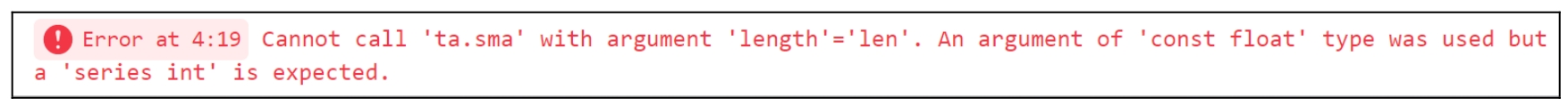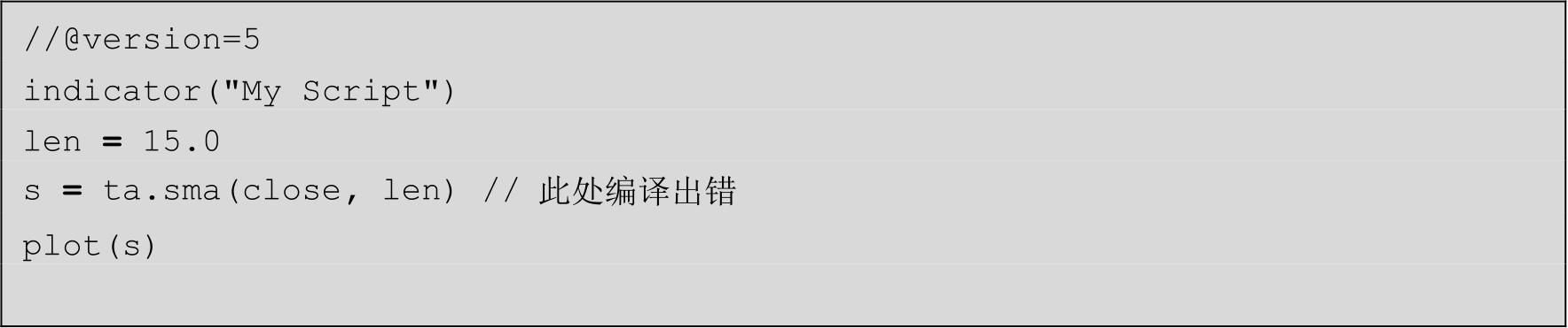 出现这个错误的原因是变量len是const float类型,而函数ta.sma(source,length)的参数变量length必须是整型。因此,系统不会自动进行从const float到int的数据类型转换。为了解决这个问题,我们需要使用数据类型转换函数int()。下面是正确的脚本代码。