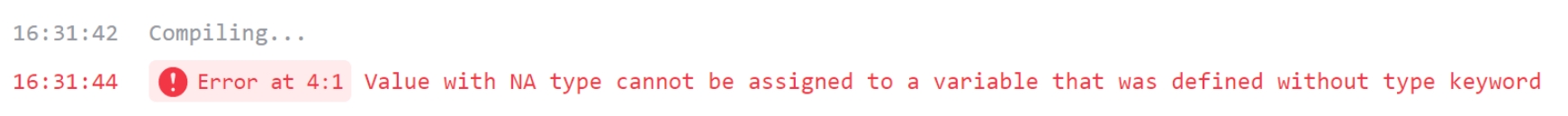 这段错误提示信息的含义在第4行代码运行中体现(发生错误),“na类型不能赋值给没有类型关键字定义的变量”,这是因为编译器不能确定myVar的数据类型。