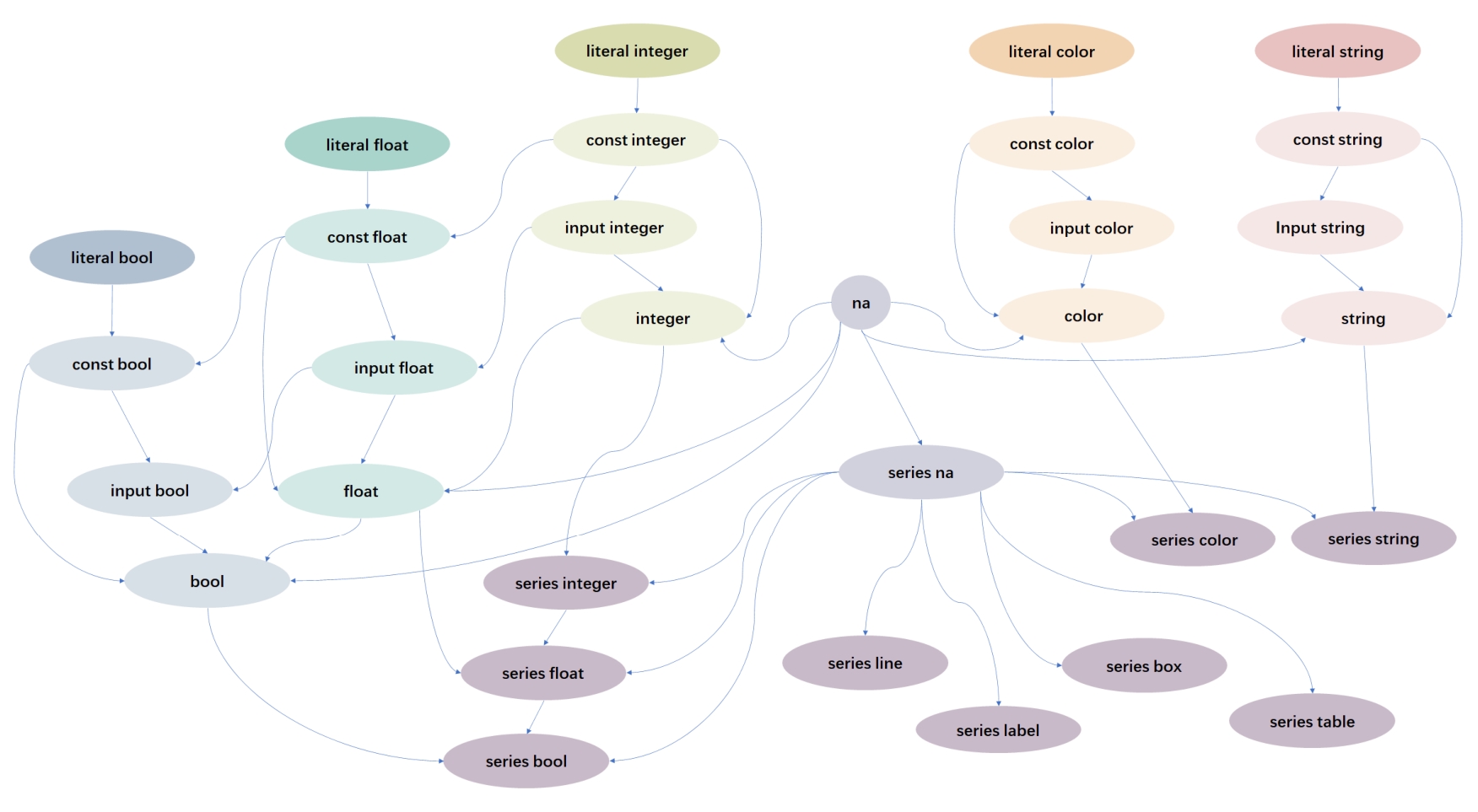 Pine Script具备数据类型的自动转换(Type Casting)功能,在图5-6中,箭头表示数据类型的自动转换方向和关系。