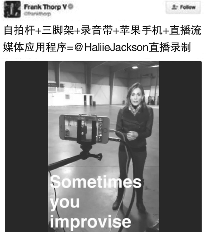 只要手机在手,NBC News的记者杰克逊就能在新闻报道的现场与受众保持联系。在报道2016年美国总统大选时,她的制作人甚至用一部苹果手机和一个自拍杆就完成了现场拍摄。