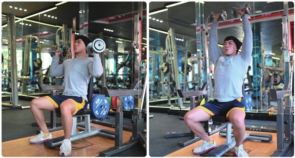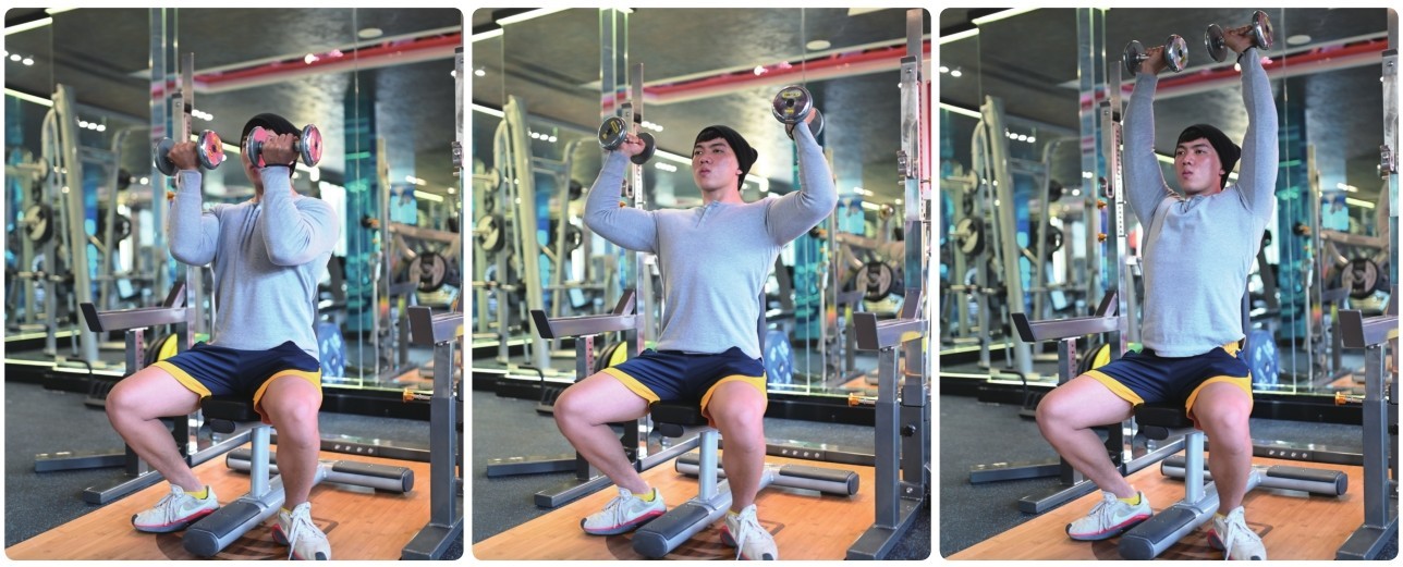 其次,做哑铃推举时,肘关节、腕关节更灵活,这就意味着可以用传统的正手握(掌心朝前)方式,也可以在动作起始位置锤握哑铃(中立握法、掌心相对),或者以最舒服的方式抓握哑铃。