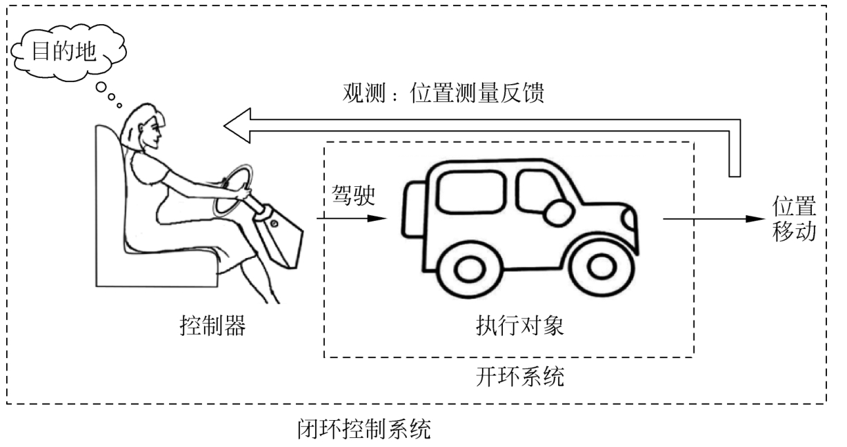 如果隐藏车辆内部复杂的机电系统,将其简化为一个受控的执行对象,那么从控制理论的角度分析,车辆行驶的过程是一个刚性物体在控制系统作用下的移动过程。在这个过程中,如果没有驾驶员的介入,控制系统将处于不稳定的开环状态,换言之,让传统车辆在没有驾驶员的情况下自行上路行驶是极不安全的。如果希望控制系统稳定,通常的做法是为受控对象建立反馈环节并进行闭环控制。因此传统车辆的行驶必须配备驾驶员,通过驾驶员的介入,使车辆的行驶始终处于稳定的闭环控制之中,以达到安全行驶并顺利抵达目的地的最终要求。