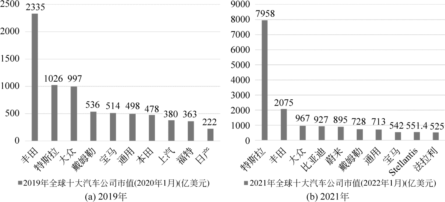 图1.5 2019年与2021年市值前十名汽车公司的比较