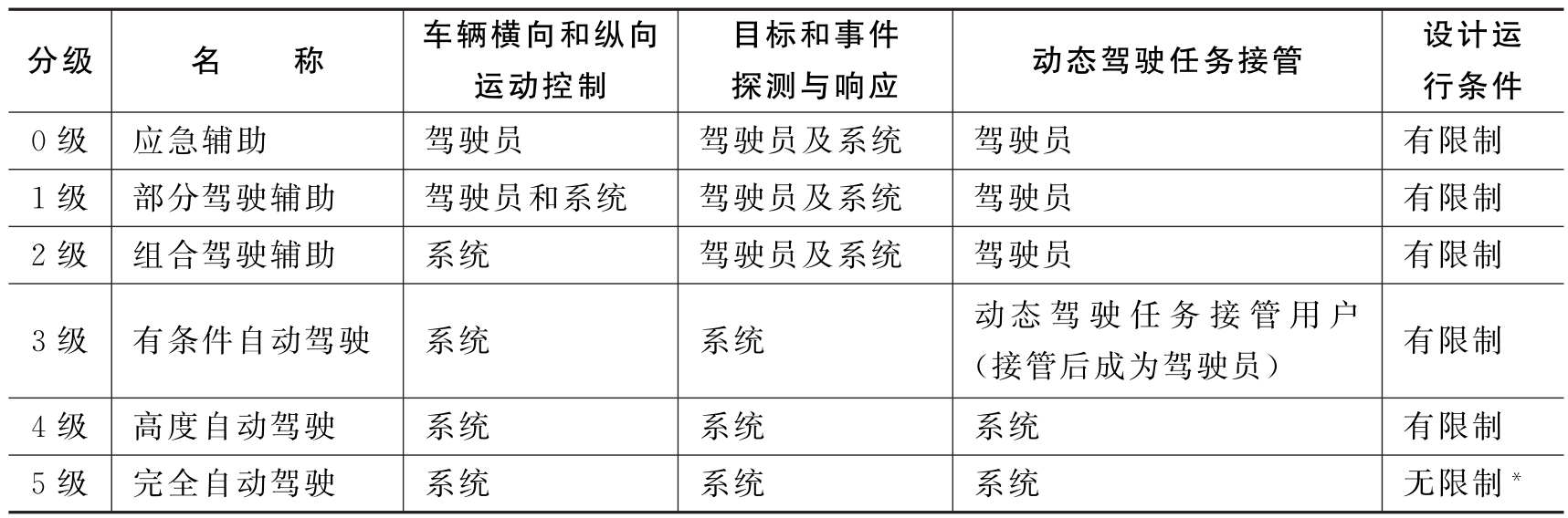 2020年3月9日,工信部发布《汽车驾驶自动化分级》推荐性国家标准报批公示。如表1.2所示,基于驾驶自动化系统(自动驾驶系统,表中简称系统)能够执行动态驾驶任务的程度,根据在执行动态驾驶任务中的角色分配以及有无设计运行条件限制等,将驾驶自动化分成0~5级。与SAE的分级标准对比,中国的自动驾驶分级与SAE划分的等级基本一致。不同点在于,SAE J3016将自动紧急制动系统(autonomous emergency braking,AEB)等安全辅助功能和非驾驶自动化功能都放在L0级,归为“无驾驶自动化”,而中国标准则称之为“应急辅助”,与非驾驶自动化功能进行区分。