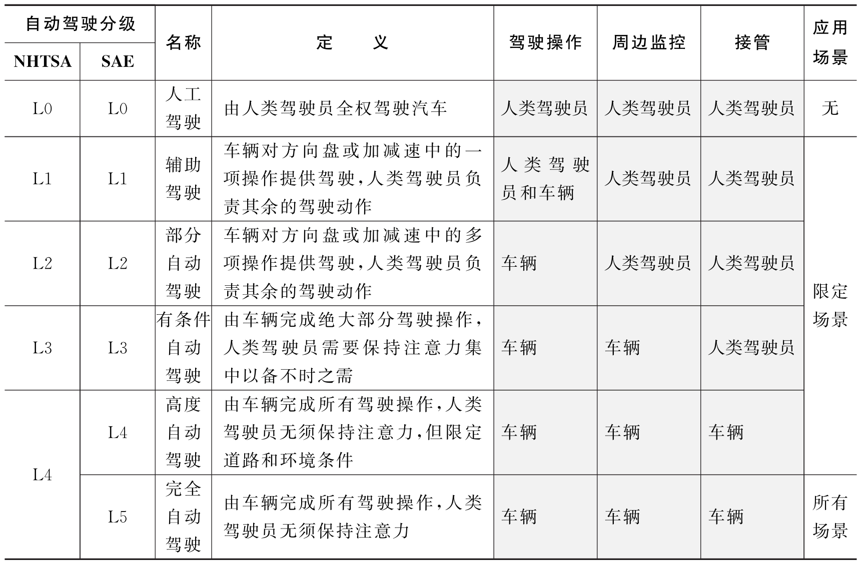 为实现完全替代驾驶员这个最终目标,自动驾驶技术在实现过程中被划分出多个阶段性目标,即分级标准。如表1.1所示,目前国际上的分级标准主要有两个:一个是2013年由美国交通运输部下辖的美国国家高速公路交通安全管理局(NHTSA)发布的自动驾驶的分级标准,其对自动化的描述共有4个级别;另一个是2014年由国际汽车工程学会(SAE,原译:美国汽车工程师学会)制定的自动驾驶分级标准J3016(《标准道路机动车驾驶自动化系统分类与定义》),其对自动化的描述分为5个等级。两个分级标准拥有一个共同之处,即自动驾驶车辆和非自动驾驶车辆之间存在一个临界点,即车辆本身是否能控制一些关键的驾驶功能,例如转向、加速和制动,这个临界点也决定了驾驶行为的责任主体是人类驾驶员还是车辆本身(自动驾驶系统),这对自动驾驶车辆的量产非常关键。2018年,SAE对J3016进行了修订,进一步细化了每个分级的描述,并强调了防撞功能,目前它已经成为业界主要采用的自动驾驶分级标准。