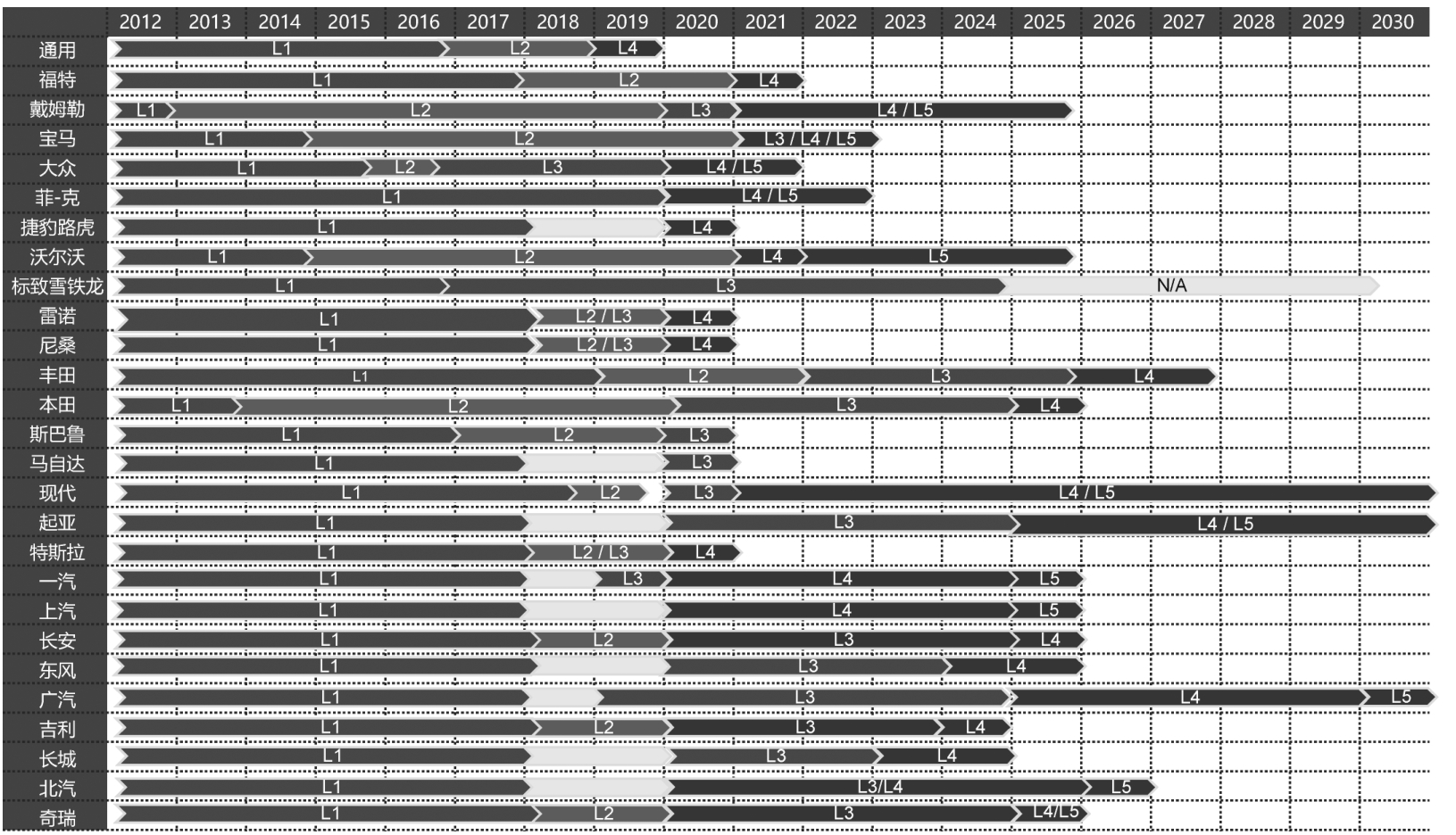 图1.6 著名品牌汽车厂商自动驾驶汽车投产时间路线图