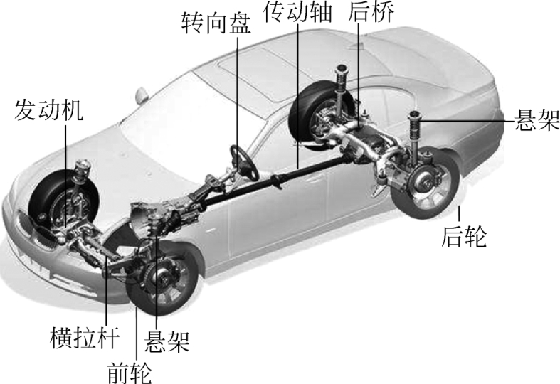 基础装置中的能源存储转化和动力输出部分,也就是油箱(储能电池)、汽油机(电动机)等系统相对十分复杂,相关技术不但能应用在车辆上,而且也广泛地被应用在飞机、轮船等交通载具以及其他很多工业、民生、军事设备之中,其发展的历史更早,应用的领域更宽泛,本书在此不再进行展开介绍。如图2.2所示,动力传动、车辆悬架、转向控制、刹车制动等部件装置都包含在汽车底盘系统中,汽车底盘连接着发动机系统、操作控制系统和车轮,是承载和安装车辆轿体和所有车载系统的关键部件,其性能将直接影响车辆的行驶功能。为实现车辆的自动驾驶功能,自动驾驶系统必须要将车辆底盘的结构和性能参数等一并纳入其整体的设计之中。