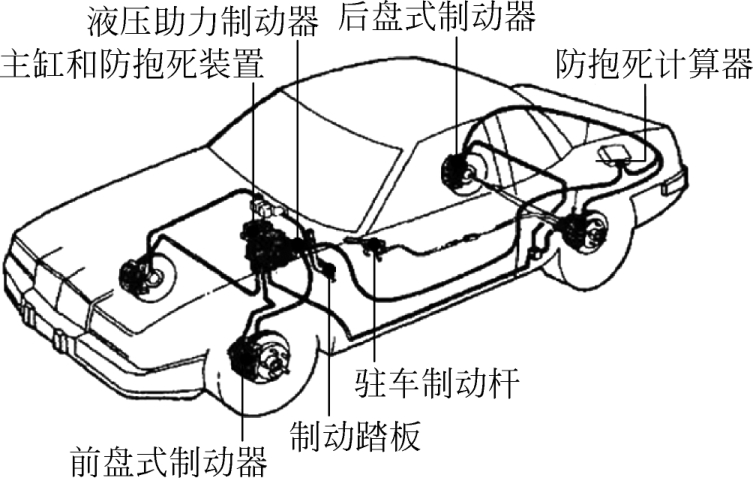 刹车制动装置(制动系统)是保障汽车安全行驶的重要装置。刹车实现了对车辆的制动,让汽车稳定在停止状态,或者由运动状态逐步减速到停止的稳定状态。如图2.6所示,对汽车进行制动需要提供内在制动力,制动系统是产生制动力的关键部件,通常制动系统包括制动器(俗称刹车器)和制动驱动两个组成部分。