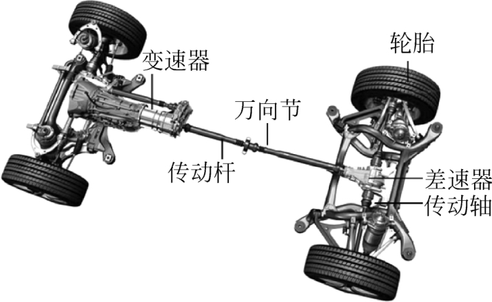 汽车的动力传动装置发展至今已经基本成熟,目前主要有三类,分别是燃油动力传动、混合动力传动和纯电动力传动。如图2.3所示,动力传动装置的主要功能是将发动机输出的动力传递到车轮上,让车轮转动以保证车辆的行进。动力传动装置是使汽车上路行驶的基础部件之一。在发动机输出同等功率的前提下,动力传动装置的性能对汽车的驱动力和车速有决定性的影响。