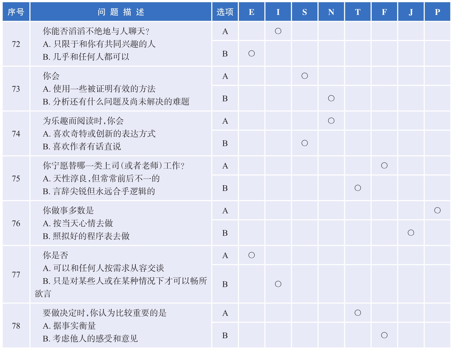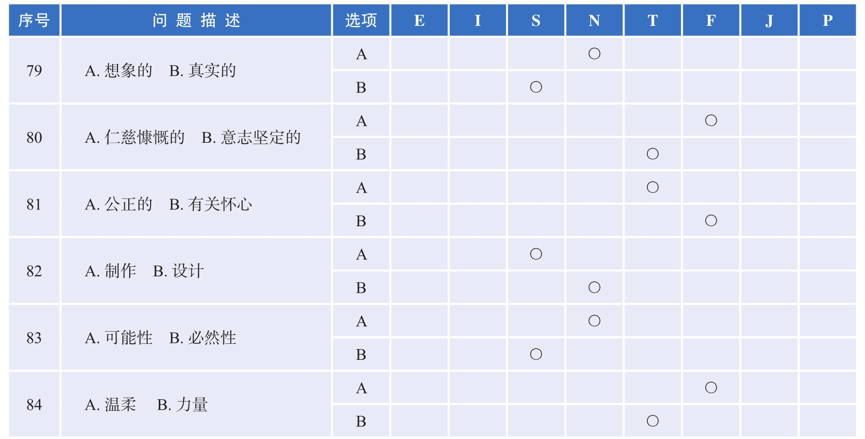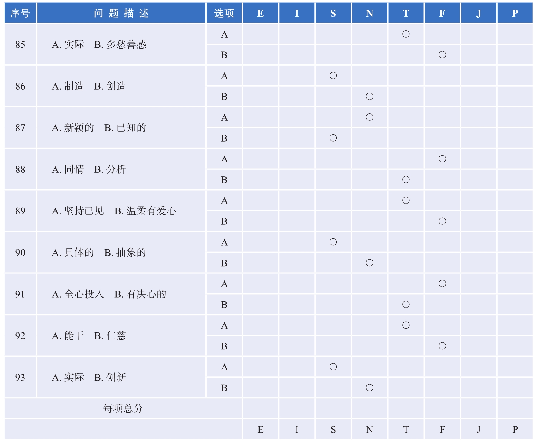 本测试分为四部分(见表2-1~表2-4),共93题;需用时约18分钟。所有题目没有对错之分,请根据自己的实际情况选择。将你选择的A或B所在的○涂黑,例如●。
