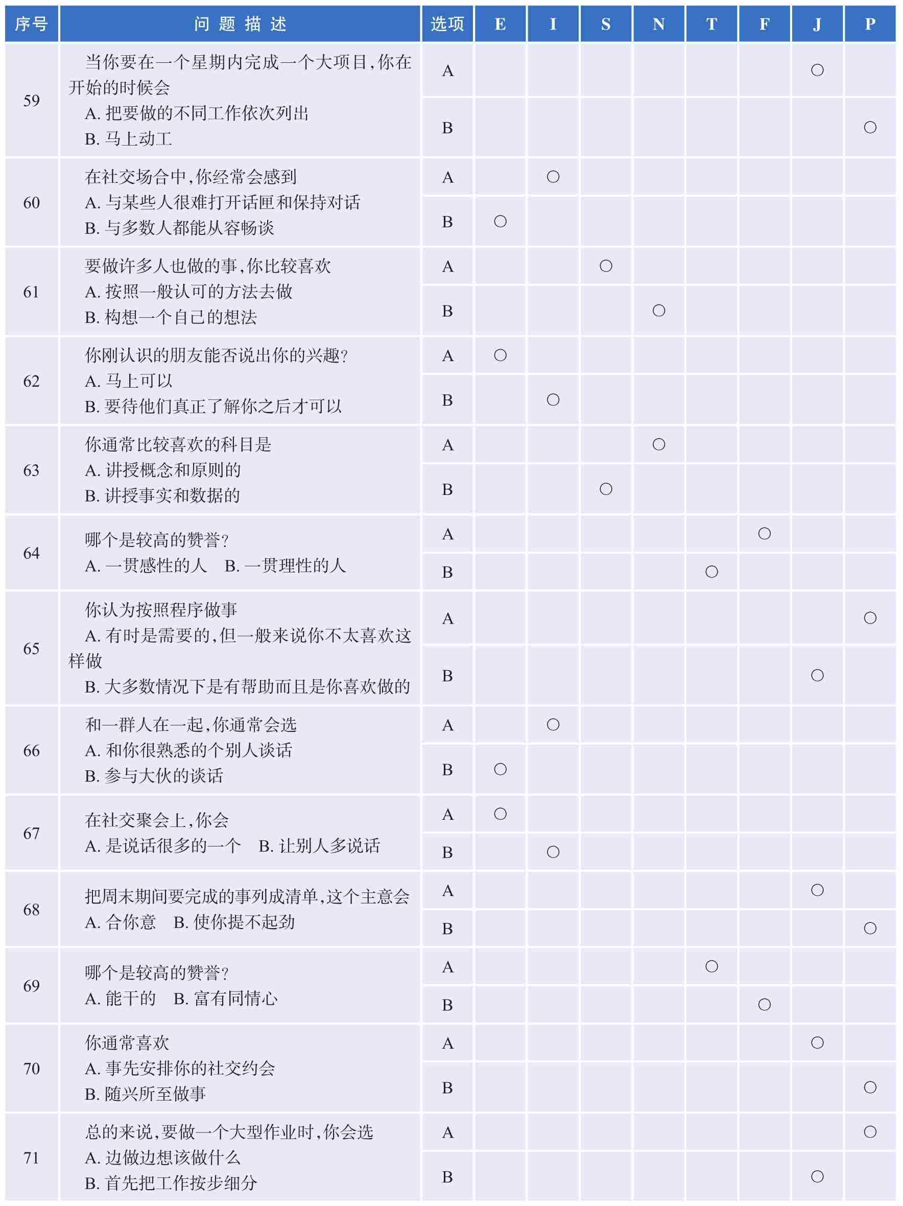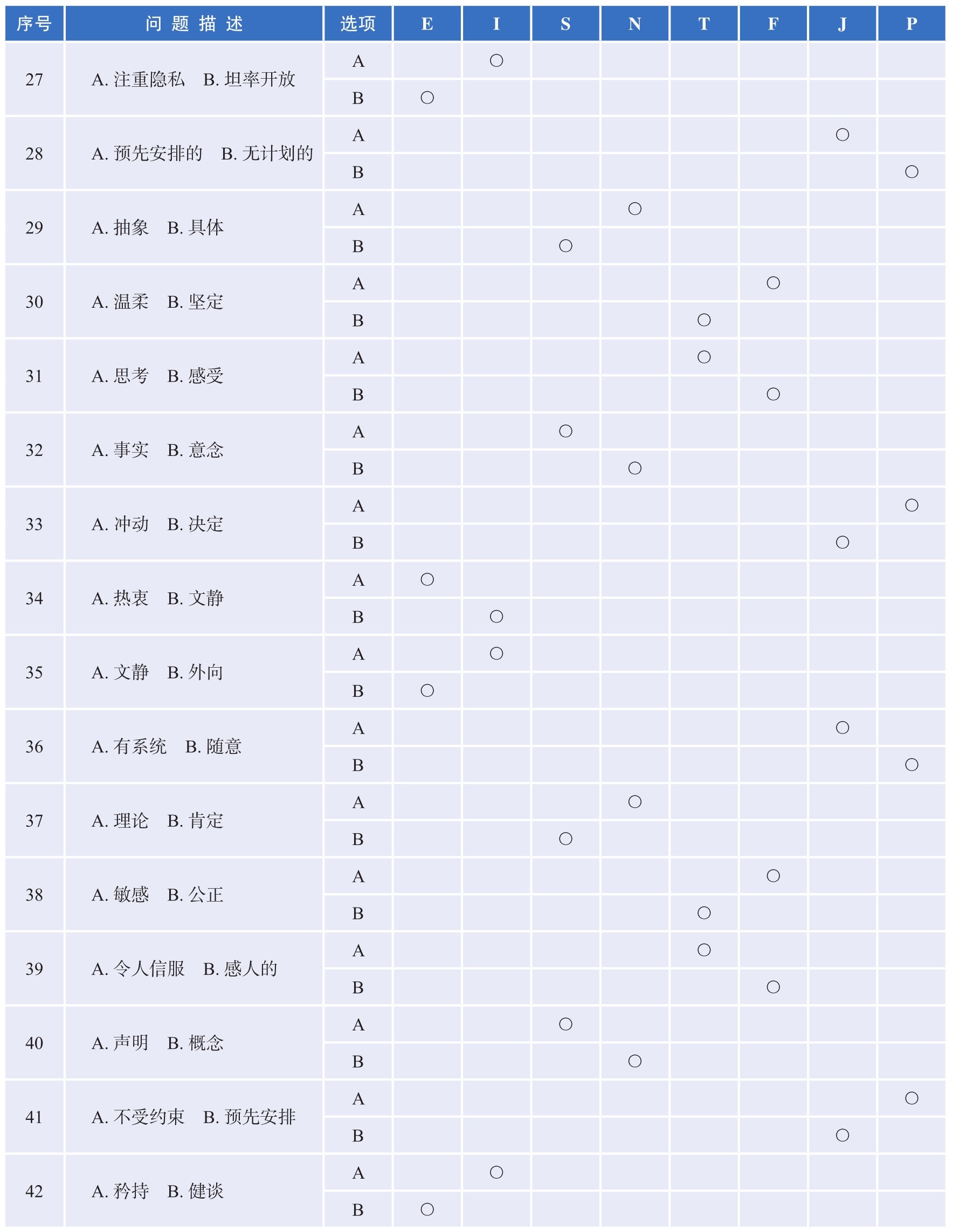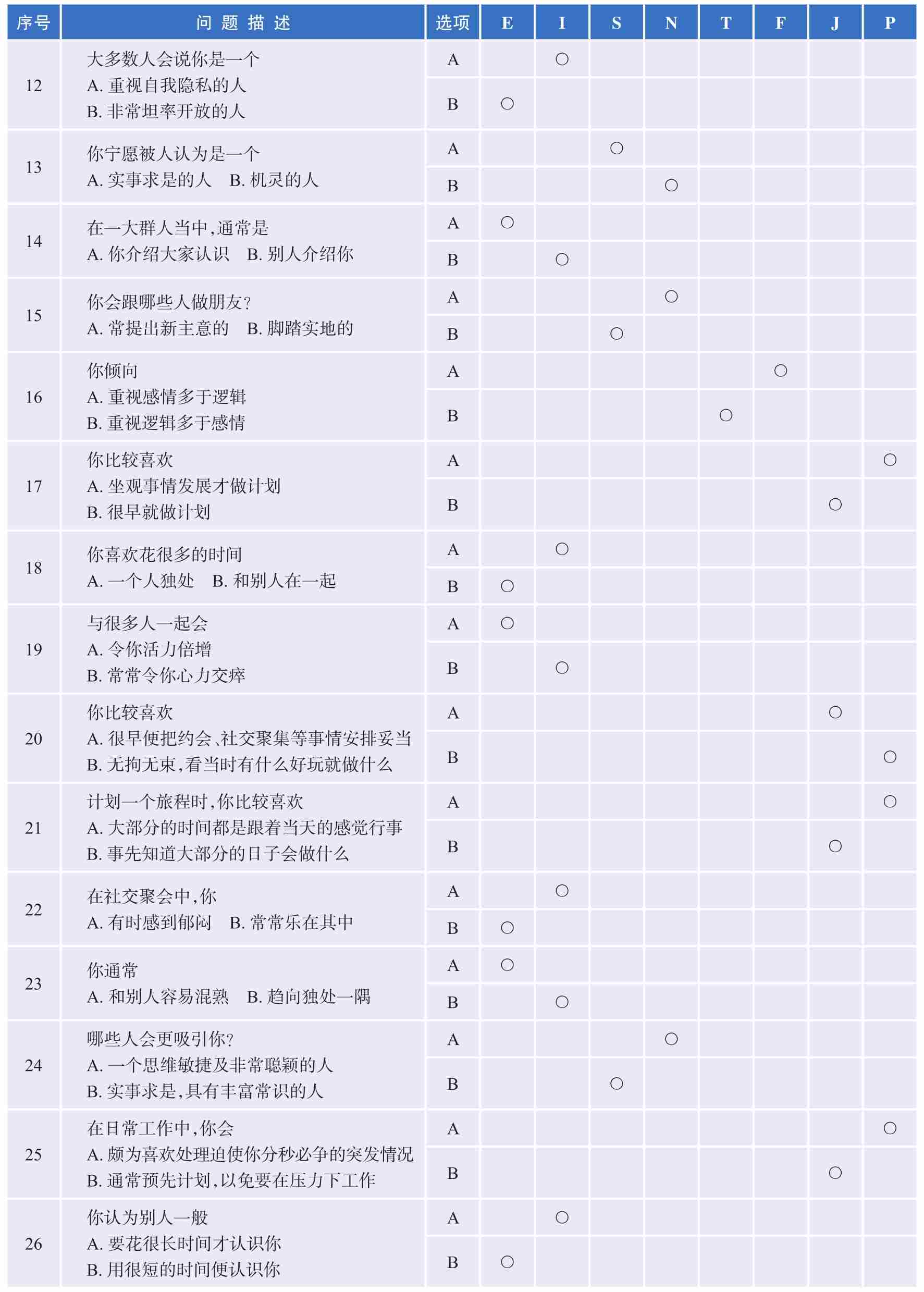 本测试分为四部分(见表2-1~表2-4),共93题;需用时约18分钟。所有题目没有对错之分,请根据自己的实际情况选择。将你选择的A或B所在的○涂黑,例如●。