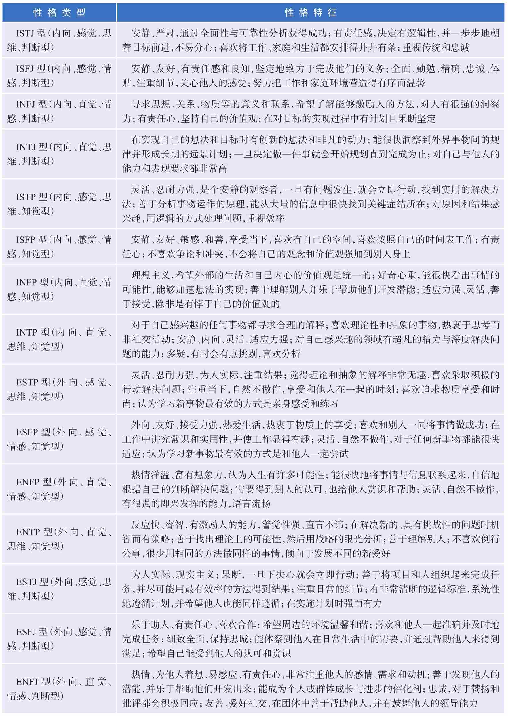 人的性格是复杂的,四个维度之间会互相影响,所以正确地认识和理解一个人的方法应是将四个维度结合起来。在MBTI中,四维八极构成了16种不同的人格类型。MBTI性格类型对照见表2-9。