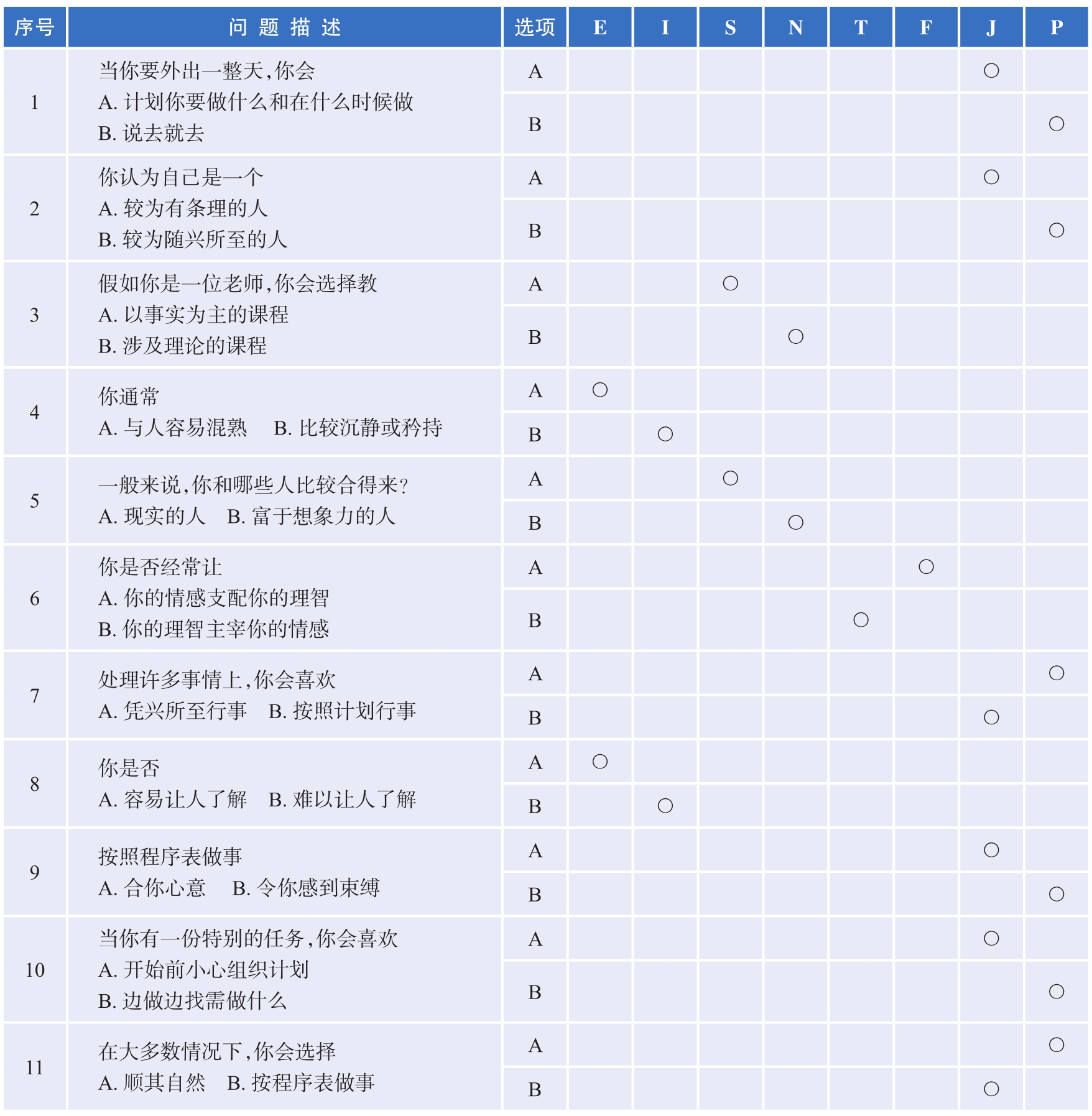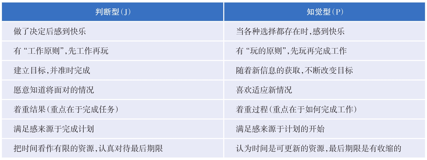 判断型倾向于以一种有序的、有计划的方式对其生活加以控制,期望看到问题被解决,习惯并喜欢做决定;知觉型个体偏好于知觉经验,他们不断地收集信息以使其生活保持弹性和自然。他们努力使事件保持开放性,让其自然地变化,以便出现更好的事件。判断型与知觉型表现对比见表2-8。