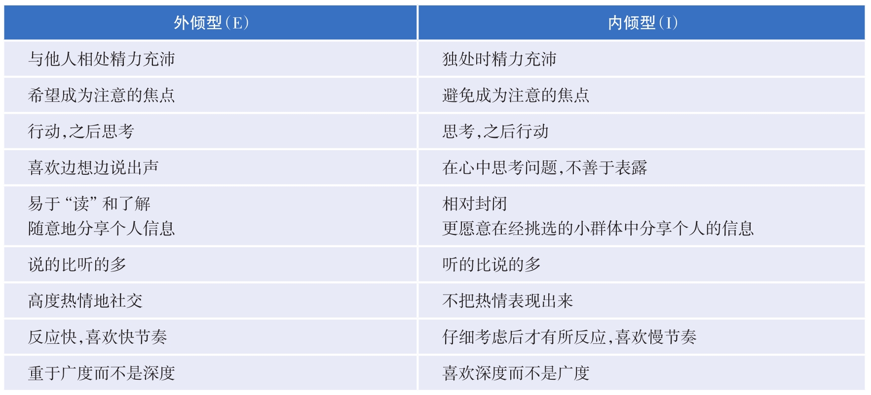 外倾型比较注重外在环境的变化,需要通过经历来了解世界;内倾型关注内部精神世界,其心理能量通过内部的思想、情绪等获得。外倾型与内倾型表现对比见表2-5。
