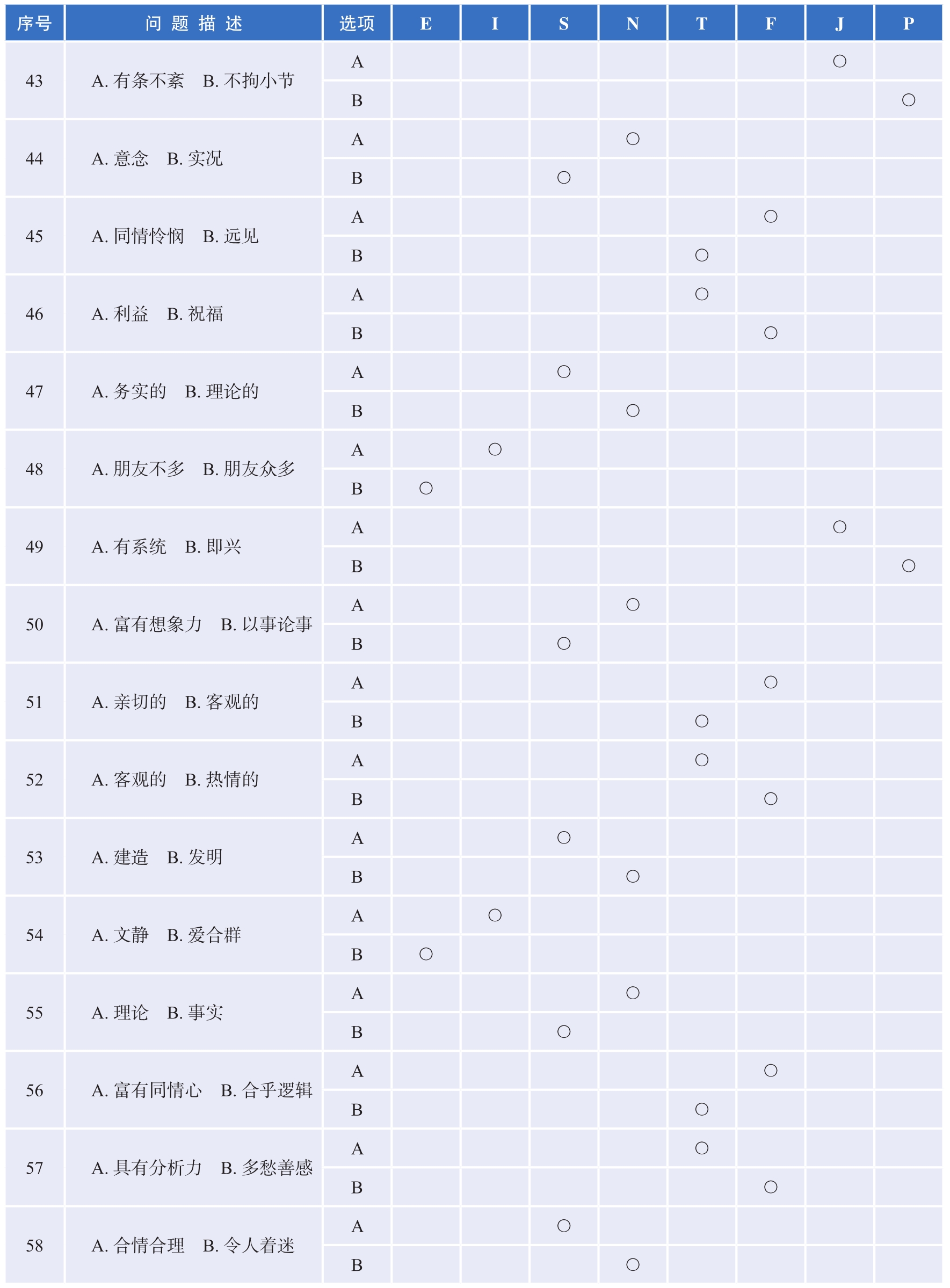 以上八个偏好两两组合,即EI、SN、TF、JP各是一对组合,在每一对组合中,得分高的即为你的优势类型。如果同分,选择后面的那一个。四组逐一比较将会得到一个由四个字母组成的优势类型,如ESTJ型。