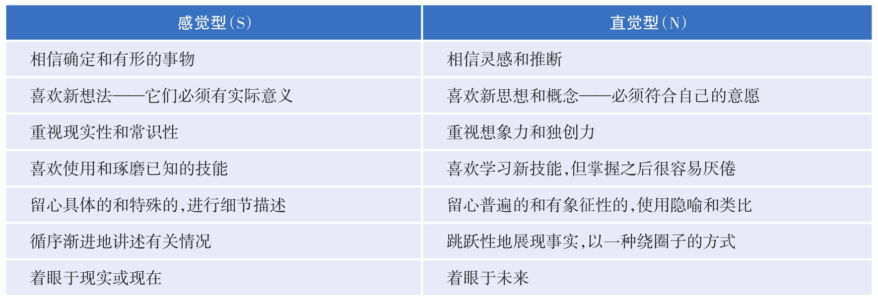 该维度表示个体关注外在世界的方法,即倾向于通过各种感官去注意现实的、直接的、实际的、可观察的事件还是对事件将来的各种可能性和事件背后隐含的意义及符号和理论感兴趣。感觉型与直觉型表现对比见表2-6。