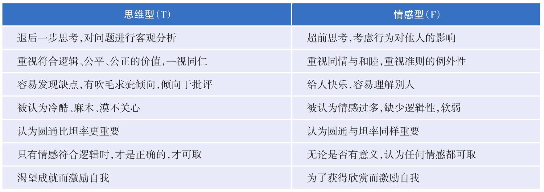 思维型依据客观事实的、非个人的逻辑分析来做决定,他们注重因果关系并寻求事实的客观尺度,因此较少受个人感情的影响;情感型期望自己的情感与他人保持一致,他们做决定的基石是什么对他们自己和他人是重要的,情感型做决定的依据是个人的价值观。思维型与情感型表现对比见表2-7。