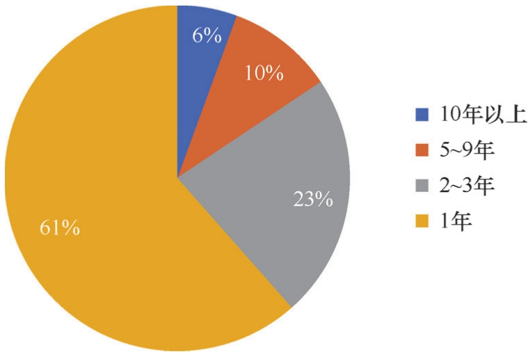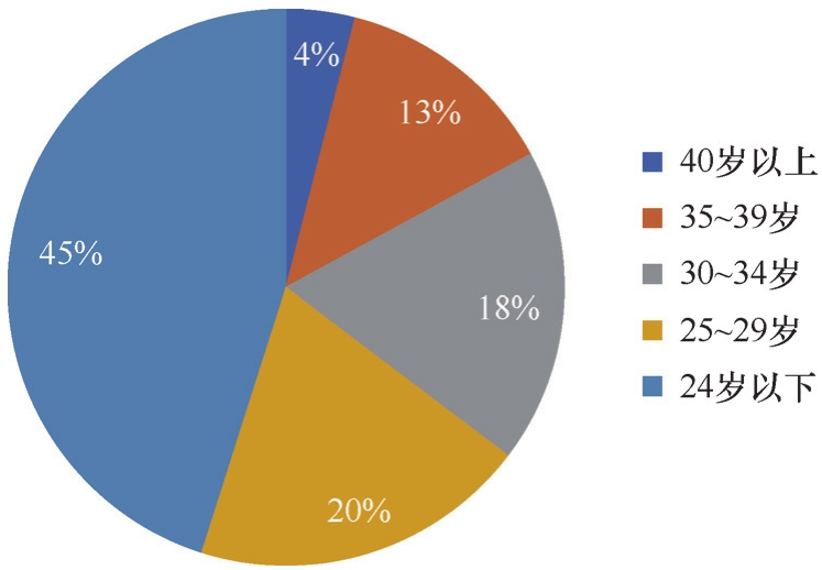 在122人中,从人员类别来看,技术人员94人,占77%;管理人员28人,占23%(见图1-1)。从员工级别来看,D级别1人,占1%;E级别7人,占6%;F级别43人,占35%;G级别46人,占37%;H级别24人,占20%;I级别1人,占1%(见图1-2)。从工作年限来看,10年以上7人,占6%;5~9年12人,占10%;2~3年28人,占23%;1年75人,占61%(见图1-3)。从年龄分布来看,40岁以上5人,占4%;35~39岁16人,占13%;30~34岁22人,占18%;25~29岁24人,占20%;24岁以下55人,占45%(见图1-4)。