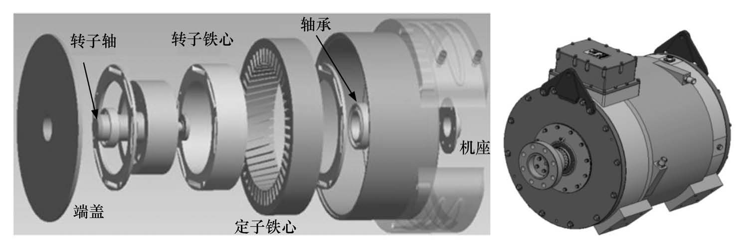 永磁同步电动机的结构示意图与电动机外形图如图2-1所示,主要包括机座、定子铁心、定子绕组、转子铁心、永磁体、转子轴、轴承及电动机端盖等部分,此外还有转子支撑部件、通风孔或者冷却水道、外部的接线盒等。