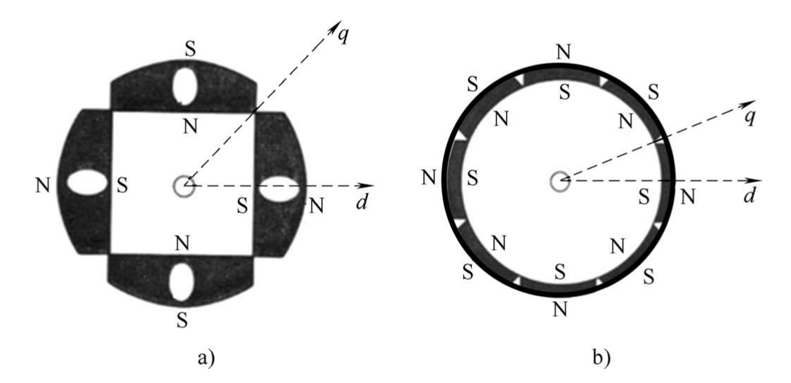 图2-5a中电动机极对数为2,图2-5b中电动机极对数为4,两幅图中都已经标出了 d 轴线与 q 轴线的位置。 d 轴线与电动机的转子磁极所在轴线重合, q 轴线超前 d 轴线90°电角度,即与相邻两个磁极的几何中性线重合。由于磁极对数不同,所以 q 轴与 d 轴之间的机械角度差是不同的,但电角度的差都是90°。