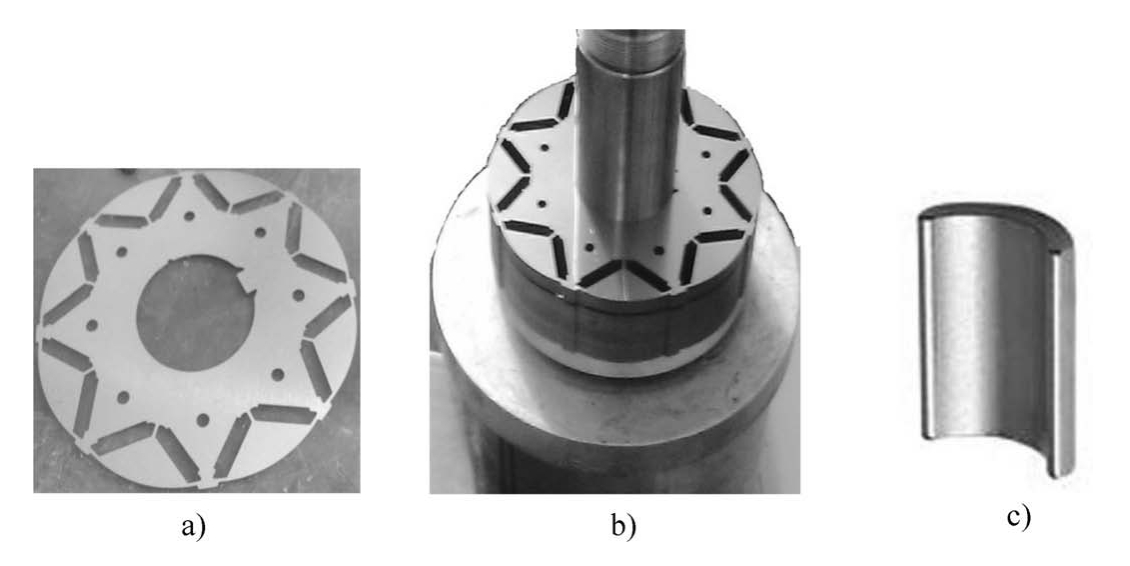a)转子铁心冲片 b)转子铁心的加工 c)瓦片状永磁体