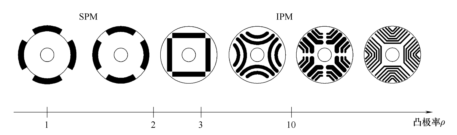 图2-7给出了不同转子结构永磁电动机凸极率的情况。其中表贴式电动机的凸极率最小,其次是表面插入式转子电动机。IPM电动机转子的结构设计灵活多样,可适用于不同的弱磁控制和恒功率运行范围的要求。其中单层(SINGLE-LAYER)磁钢结构的IPM电动机应用广泛,电动机的凸极率 ρ 可以达到3左右;双层(DOUBLE-LAYER)磁钢和三层(THREE-LAYER)磁钢结构的IPM电动机的凸极率可达到10~12;三层以上磁钢的IPM电动机采用轴向迭片(AXIALLY-LAMINATED)结构后,凸极率 ρ >12。由此可见,采用多层磁钢转子结构,可以显著提高电动机的凸极率,增加气隙磁通密度。但是,其缺点是结构和制造工艺复杂,制造成本也高。