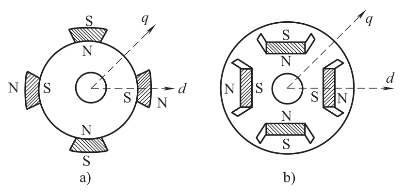早期的PMSM主要是表面式结构,见图1-6a。这样,由于永磁体的磁导率与空气相差不大,所以电动机 d 、 q 轴磁路是对称的(有 L d = L q ),此时电动机相当于传统电励磁同步电动机中的隐极同步电动机。在控制中,根据转子位置确定定子电流矢量的相位(电流超前转子90°电角度),定子电流幅值 i 1m 根据转矩命令的大小确定,见下式: