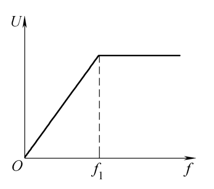 电动机运行的基本问题(电与磁之间的相互作用)在电动机的控制过程中必须得到很好的处理。由于铁磁性导磁材料存在磁饱和现象,所以希望电动机的磁路工作点处于轻度饱和状态,以便充分利用导磁材料。这样在较大磁场的基础上,相同的电流流过导体就可以有更大的作用力产生。这种控制方法是通过定子电压( U )与定子频率( f )之比(即压频比、伏赫比)保持恒定来实现的,如图1-4所示,在较低频率范围内,随着定子频率的增加,定子电压随之成比例上升。