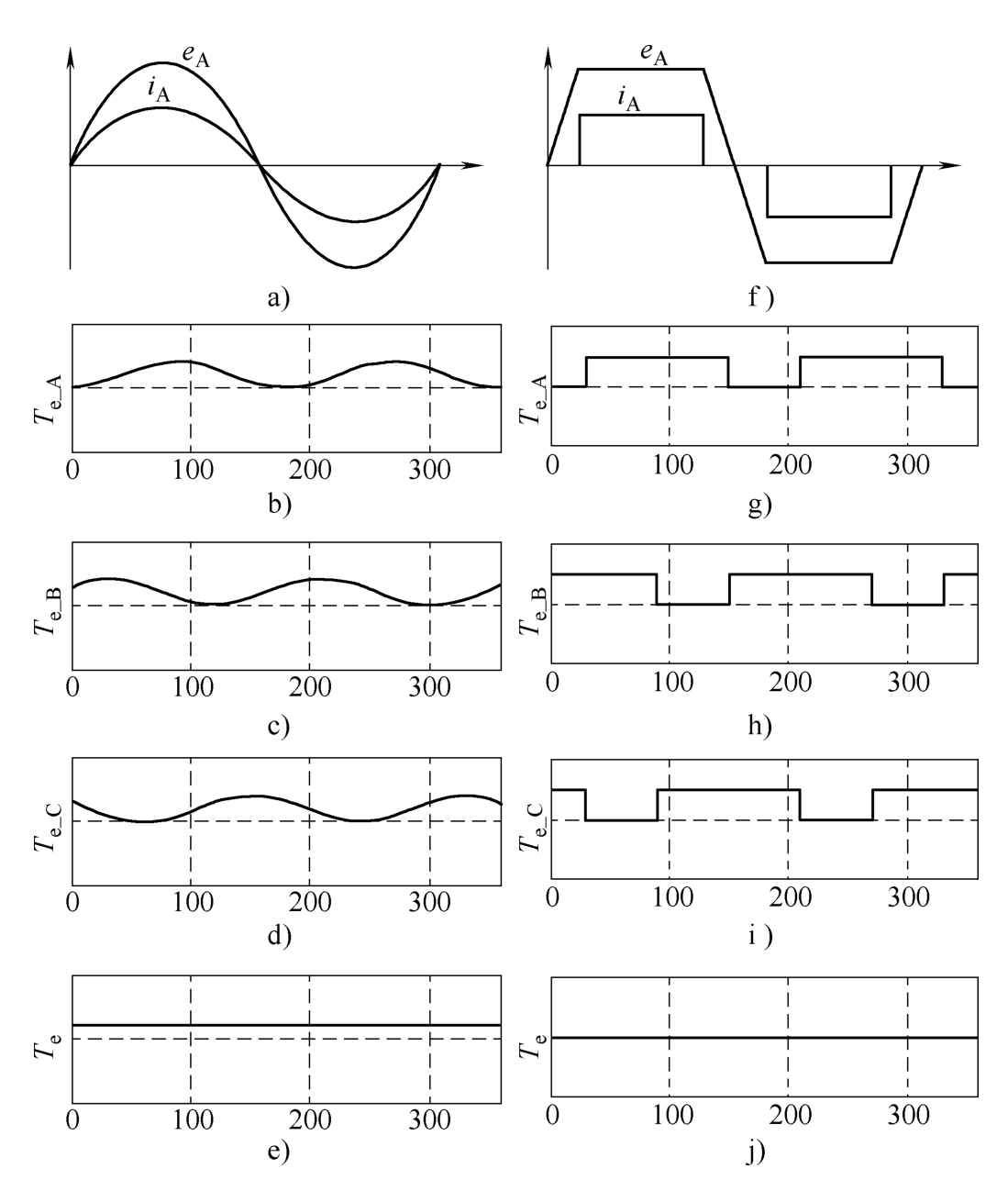 从理论上说,传统三相同步电动机转子产生的气隙主磁场是正弦波,定子电枢绕组中通入的是三相正弦电流,从而电动机可以产生恒定的电磁转矩,图1-9a~1.9e分别是PMSM的A相反电动势与A相电流、A相电磁转矩、B相电磁转矩、C相电磁转矩以及总电磁转矩。如果电动机旋转时电枢绕组切割的主磁场是恒定的,并且电枢绕组通入的又是恒定的直流电流,那么电动机也可以产生恒定的电磁转矩,图1-9f~1.9j分别是BLDCM A相反电动势与A相电流、A相电磁转矩、B相电磁转矩、C相电磁转矩以及总电磁转矩,图1-9的横坐标都是转子电角度。