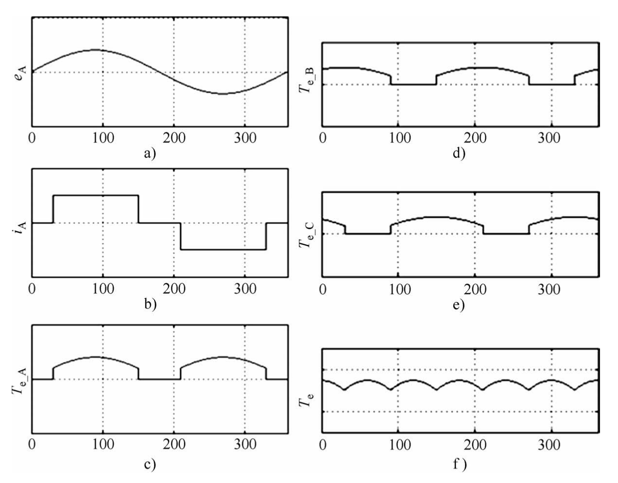 BLDCM在运行特性上与传统同步电动机有较大区别。从发展历程上来说,在BLDCM出现之前首先出现的是无换向器电动机,可以说它是BLDCM的雏形。无换向器电动机转子励磁产生的依然是正弦分布的磁场(见图1-8a),而定子绕组采用电流源逆变器供电,通过循环切换逆变器主开关向定子绕组中通以正负半周各自导通120°电角度、三相互差120°的直流电流如图1-7b所示。这种情况下,电动机可以产生有效的平均转矩;但是由于反电动势为正弦波如图1-7a所示,而定子电流为直流,所以存在着较大的转矩脉动,如图1-7f中三相的合成转矩。