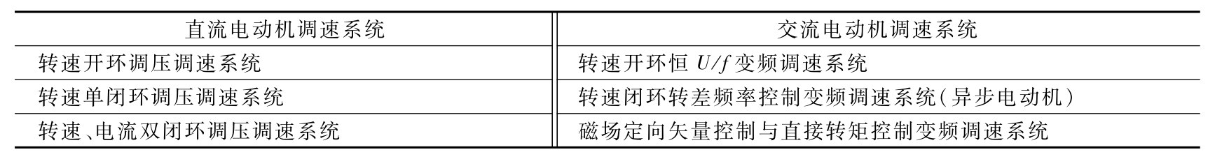 直流电动机的电气调速系统大体上有三种:转速开环调速系统、转速单闭环调速系统和转速、电流双闭环调速系统,见表1-2。为了使交流电气调速系统具有类似他励直流电动机转速与电流双闭环系统的良好调速性能,那就不得不研究高性能的控制技术——磁场定向矢量控制(Field Orientation Vector Control,FOC)技术和直接转矩控制(Direct Torque Control,DTC)技术。