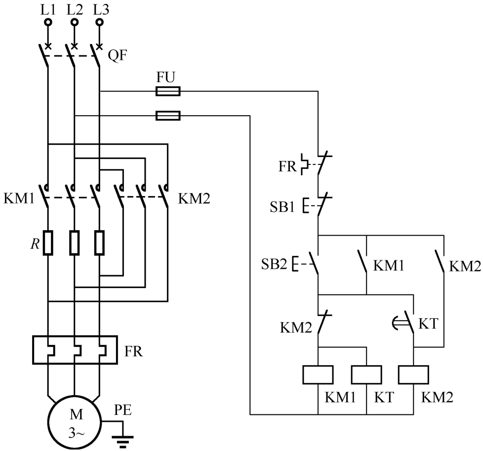起动过程如下:按下起动按钮SB2,接触器KM1与时间继电器KT的线圈同时通电,KM1主触点闭合,电动机定子绕组串电阻 R 起动。时间继电器KT延时预定时间后,其延时闭合常开触点闭合,接触器KM2线圈通电,KM2主触点闭合,短接 R ,电动机投入正常运行;KM2常闭辅助触点断开,接触器KM1与时间继电器KT的线圈同时断电。