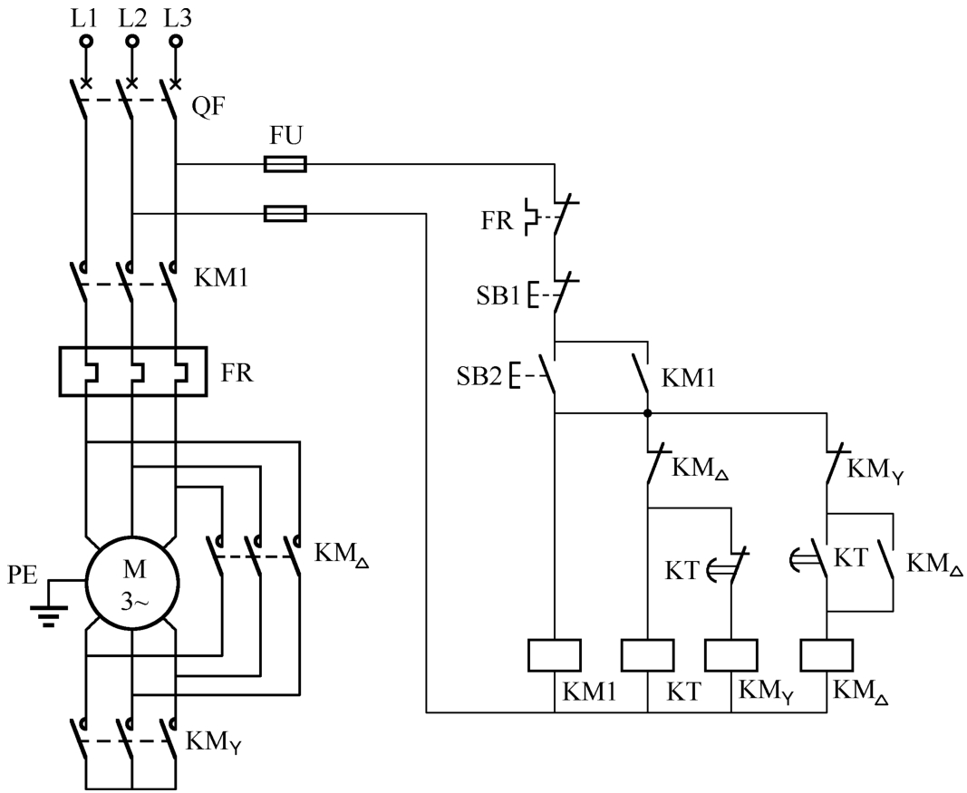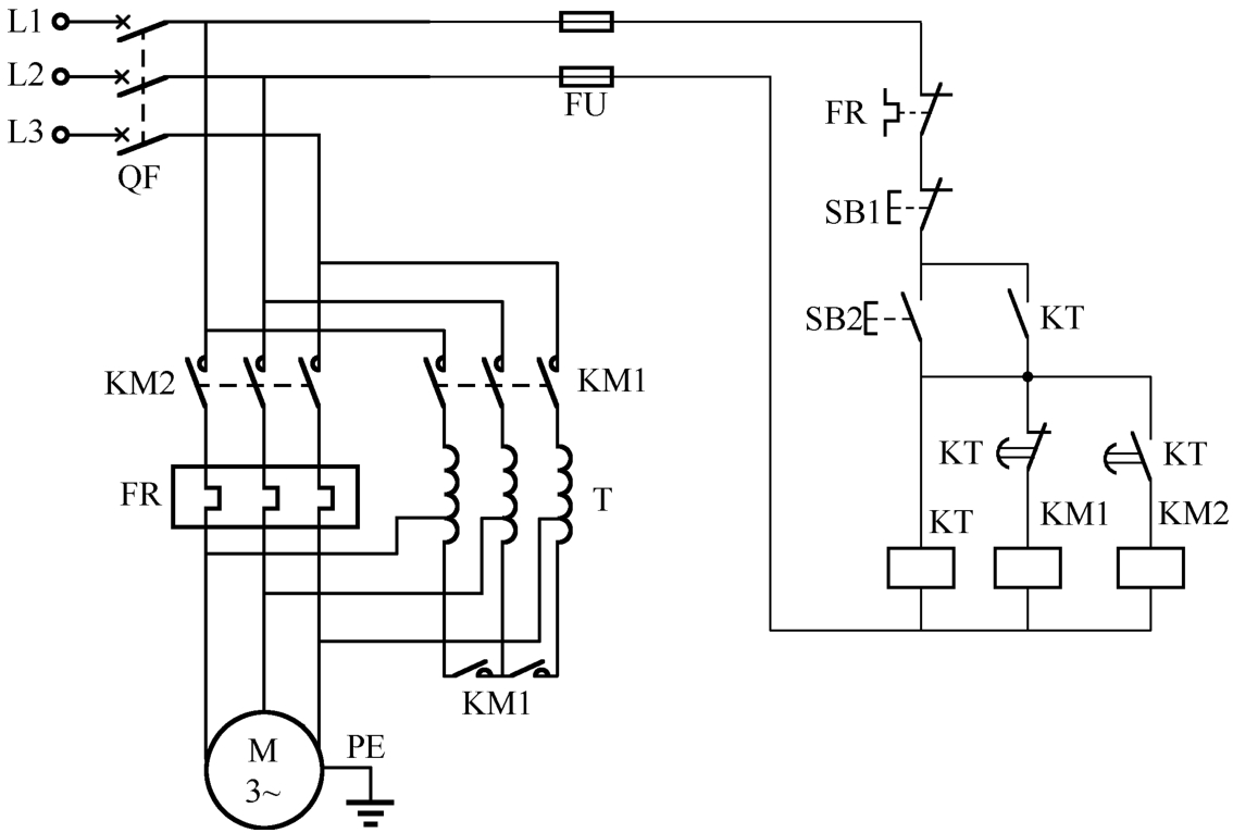 主触点闭合时,绕组接成星形,进行减压起动。当电动机转速接近额定转速时,时间继电器KT常闭触点断开,