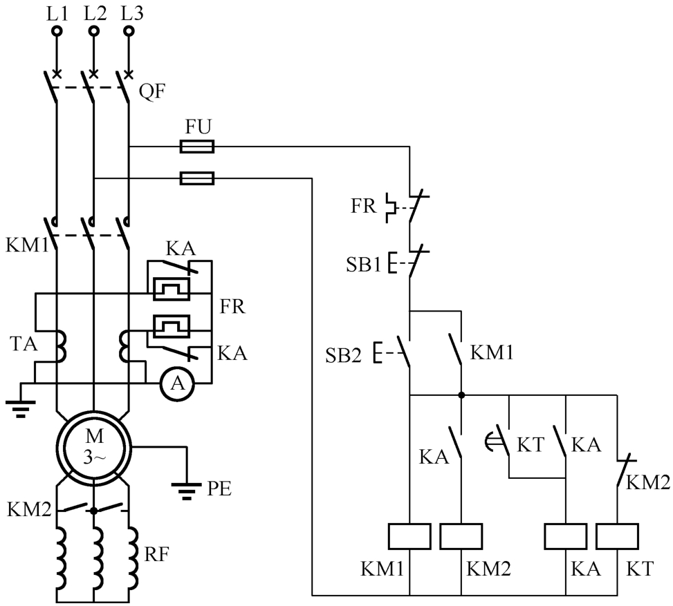 电流互感器TA的作用是将主电路中的大电流变换成小电流进行测量。为避免起动时间较长而使热继电器FR误动作,在起动过程中用KA的常闭触点将FR的加热元件短接,待起动结束,电动机正常运行时才将FR的加热元件接入电路。