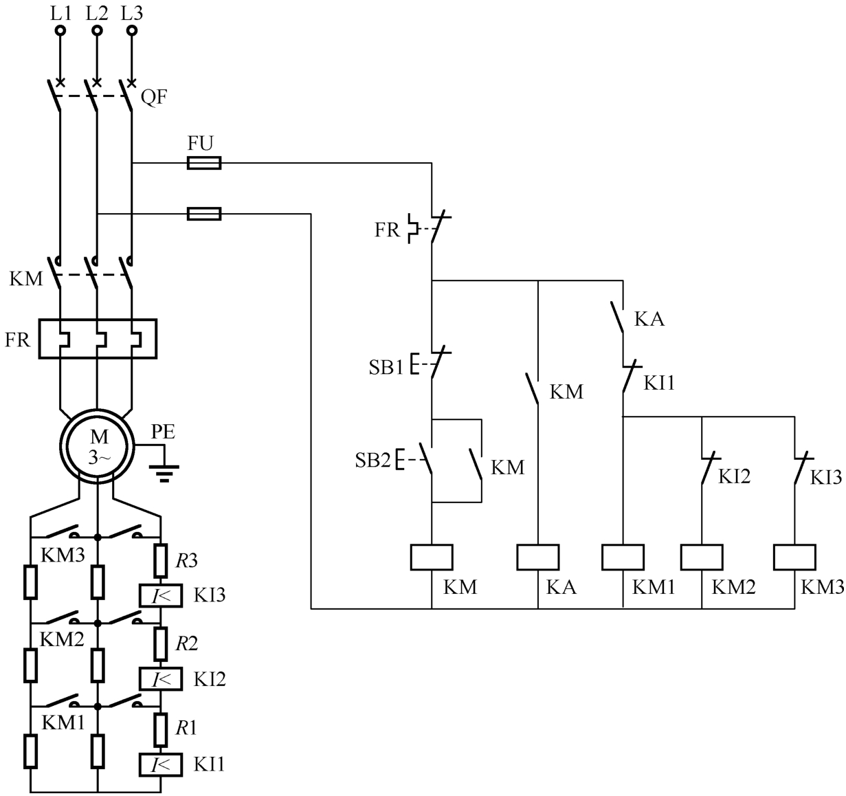 起动过程如下:按下起动按钮SB2,接触器KM通电,电动机M串入全部起动电阻( R 1+ R 2+ R 3)起动,中间继电器KA通电,为接触器KM1~KM3通电做准备。随着电动机转速的升高,起动电流逐步减小,首先KI1释放,KI1常闭触点闭合,使接触器KM1通电,KM1常开触点闭合,短接第一级起动电阻 R 1;然后KI2释放,KI2常闭触点闭合,使接触器KM2线圈通电,KM2常开触点闭合,短接第二级起动电阻 R 2;KI3最后释放,KI3常闭触点闭合,KM3线圈通电,KM3常开触点闭合,短接最后一级电阻 R 3。至此,电动机起动过程结束。