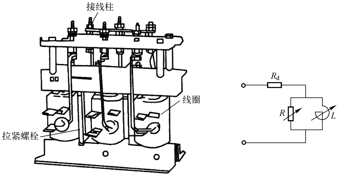 图2-18为频敏变阻器的结构和等效电路。频敏变阻器实际上是一个特殊的三相铁心电抗器,它有一个三柱铁心,每个柱上有一个绕组,三相绕组一般接成星形。等效电路中的 R d 为绕组直流电阻, R 为铁损等效电阻, L 为等效电感, R 、 L 值与转子电流频率有关。