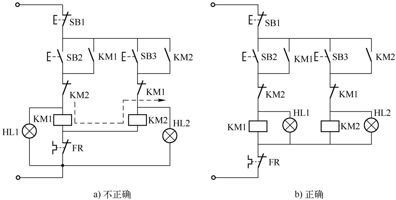 在电气控制电路的动作过程中,如果出现不是由于误操作而产生意外接通的电路称为寄生电路。图4-5a为一个具有指示灯显示和过载保护的电动机正、反向运行控制电路。正常工作情况下能完成正、反向起动、停止和信号指示。但当热继电器FR动作时,产生寄生电路,电流流向如虚线所示,使正向接触器KM1不能释放,起不了保护作用。如果改为图4-5b所示电路,则当电动机发生过载时,FR触点断开,整个控制电路断电,电动机停转。